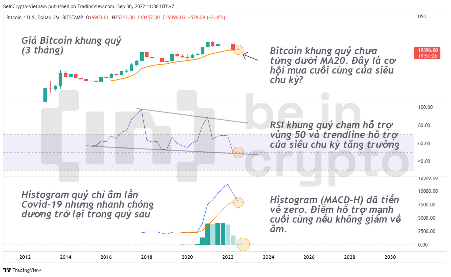 - RSI khung quý cũng vừa chạm vùng hỗ trợ 50 điểm trong tháng 9, và cũng chạm trendline RSI hỗ trợ của siêu chu kỳ. Xem như giá BTC đã đi đến trạm cuối của downtrend.
