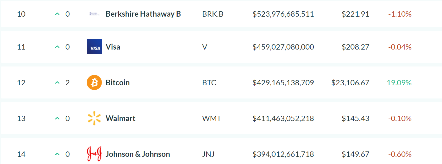 Với chuyển động giá hiện tại, vốn hóa thị trường của Bitcoin cũng đã đạt 429 tỉ USD, vượt qua cả Walmart để trở thành tài sản lớn thứ 12 trên bảng xếp hạng của AssetDash.