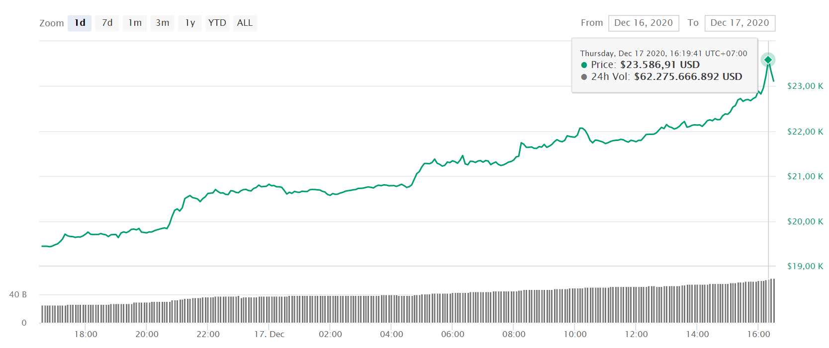 Sau khi phá vỡ cột mốc lịch sử 20.000 USD trong đầu ngày giao dịch (17/12), Bitcoin tiếp tục đi lên. Cuối giờ chiều nay, đồng tiền điện tử lớn nhất thế giới này đã chạm ngưỡng 23.106 USD, thiết lập đỉnh cao mọi thời gian mới.