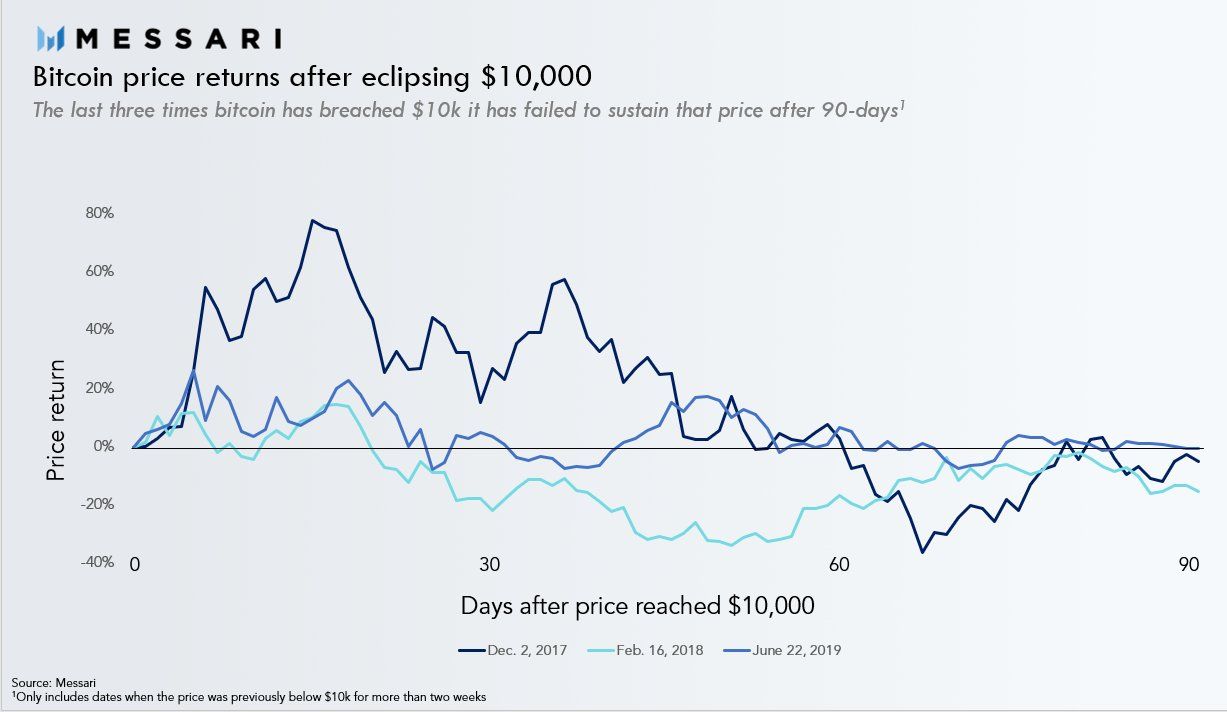 “3 lần cuối mà BTC vượt qua 10.000 USD thì sau đó đều quay đầu đi xuống trong vòng 90 ngày.” – @jpurd17