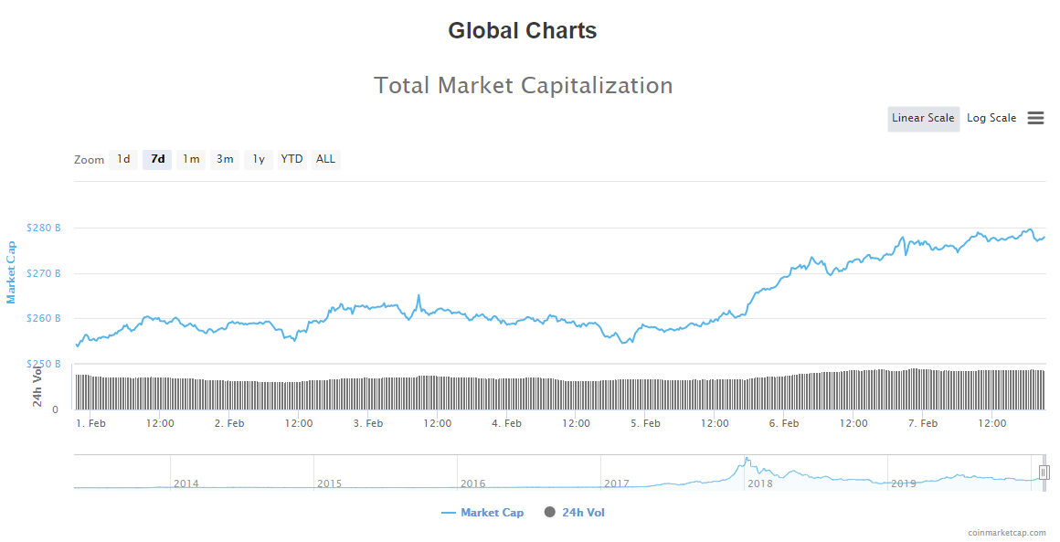 Theo số liệu từ Coinmarketcap, từ đầu tuần từ ngày 03/02/2020 đến hiện tại, đã có hơn 30 tỷ đô đổ vào thị trường nâng vốn hóa lên 280 tỷ đô, lượng vốn này vẫn đang giữ vững đà tăng và chưa có dấu hiệu chững lại.