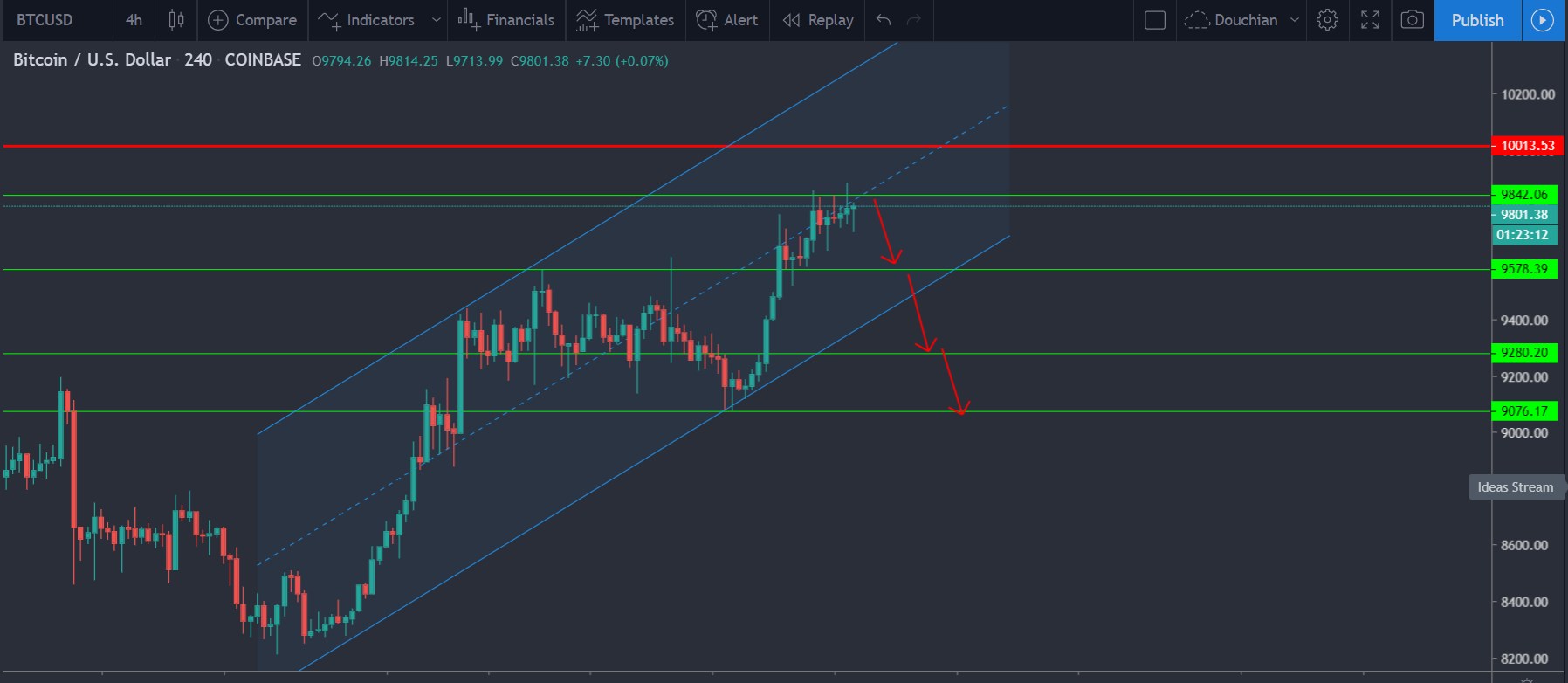 Phân tích theo kênh giá uptrend cùng đường trung tâm, giá BTC vẫn chưa phá lên được trục trung tâm trong 2 ngày kèm theo cản cứng 9800$ và nến Doji, báo hiệu khả năng BTC sẽ có một đợt điều chỉnh về đến mức giá ~9000$.