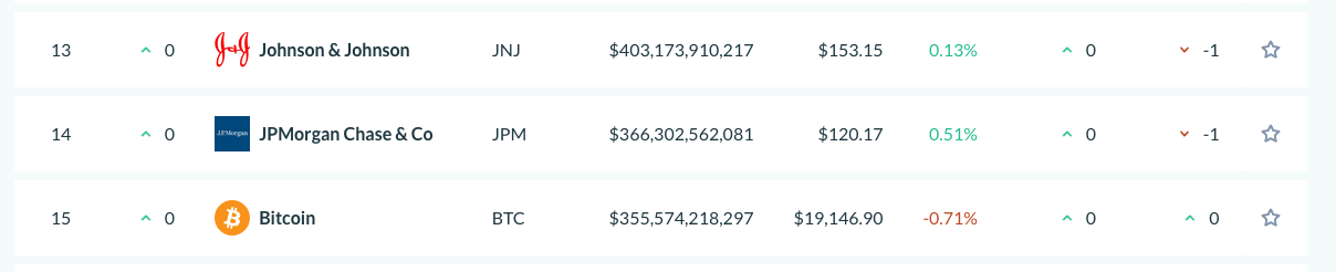 Dựa trên vốn hóa thị trường của BTC và JP Morgan, Bitcoin chỉ cần có thêm một chút ít hơn 10 tỷ USD để có thể vượt gã khổng lồ ngân hàng này.