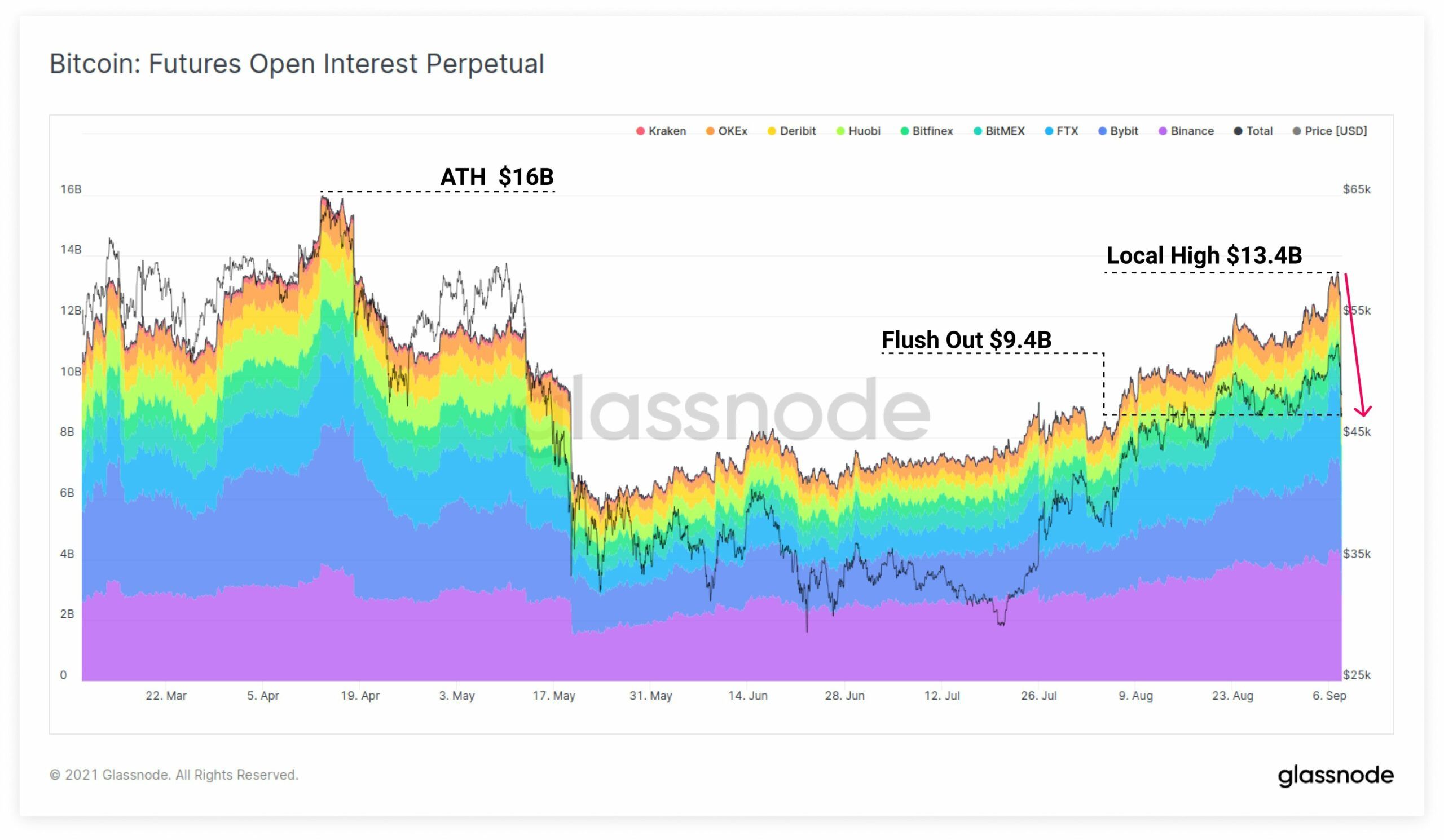 Đây là đợt lao dốc lớn nhất của thị trường tiền điện tử trong tháng này. Giá trị của các vị thế mở hợp đồng tương lai vĩnh cửu đã trở lại mức của ngày 8 tháng 8. Việc thanh lý 4 tỷ đô la cho các vị thế đòn bẩy ngày hôm qua đã được Glassnode xác nhận.