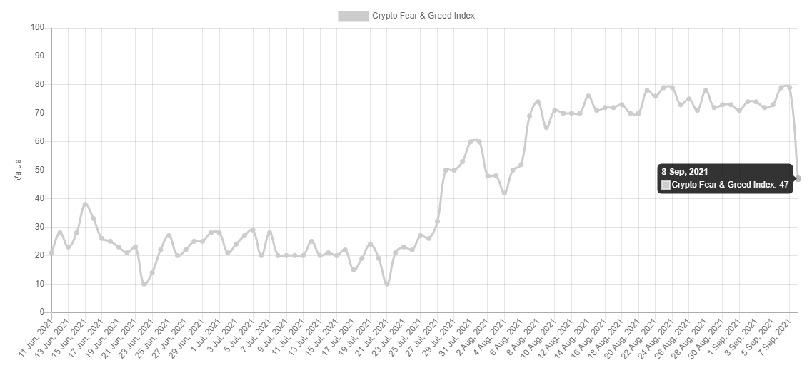 Một chỉ báo vĩ mô khác phản ứng với sự sụp đổ chớp nhoáng khi thị trường giảm mạnh là Chỉ số Sợ hãi và Tham lam. Chỉ báo này đã giảm từ mức ‘tham lam cực độ’ ở mức 79 xuống tâm lý trung lập ở mức 47 vào ngày 7 tháng 9. Chỉ báo này hiện cũng đang quay trở lại giá trị đầu tháng 8.