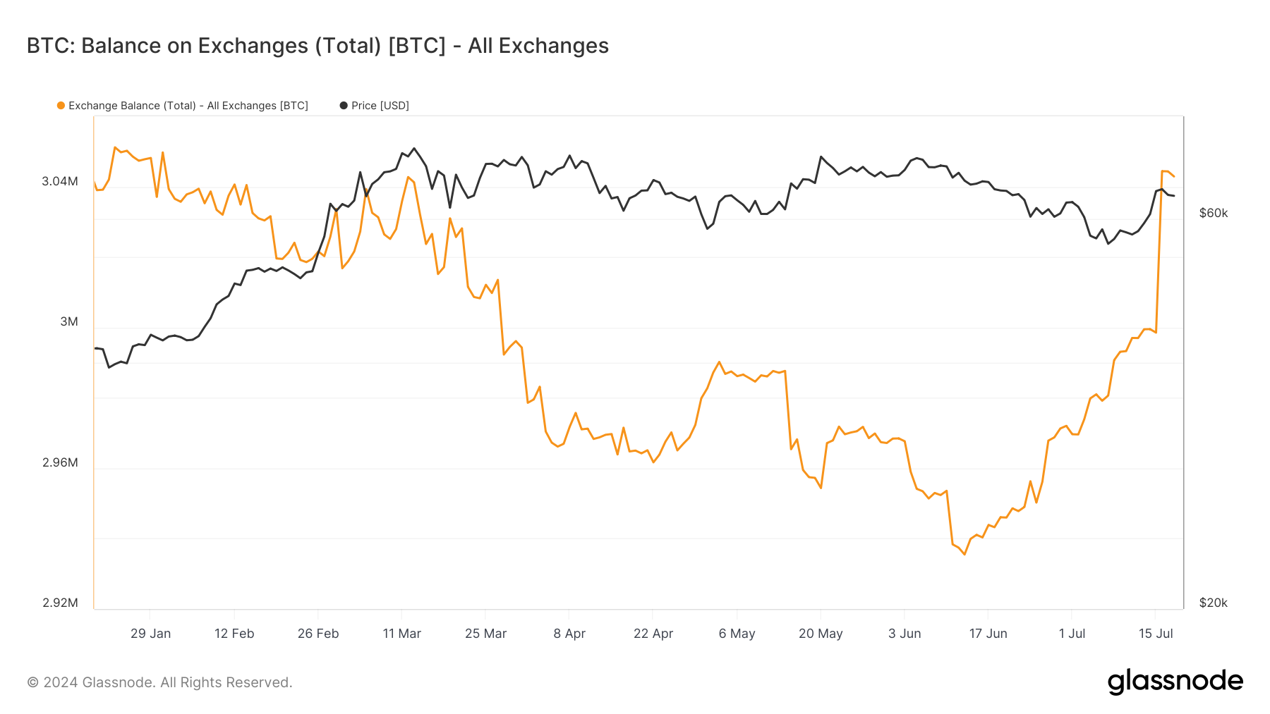 BTC gần đây đã vượt qua áp lực bán sau khi chính phủ Đức bán số coin trị giá hàng tỷ USD. Đầu tuần, giá đã phục hồi đến 65,841 USD nhưng hiện đang giao dịch ở mức 64,166 USD. Sự sụt giảm gần đây có thể liên quan đến sự gia tăng số lượng BTC trên các sàn.