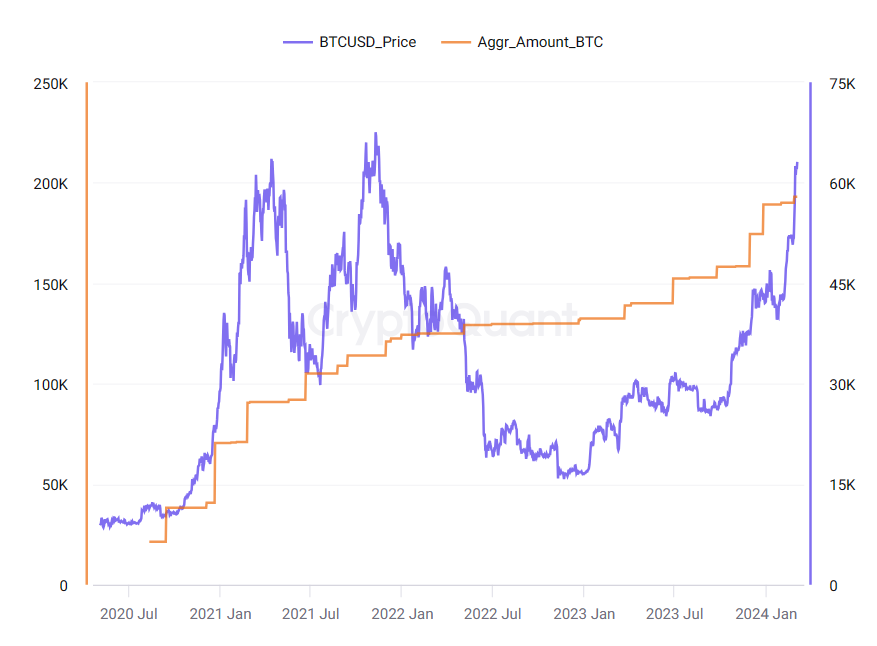 Nếu tính riêng trong năm 2024, thì Microstrategy đã mua vào 3,850 BTC, lần mua gần đây nhất là 3,000 BTC vào ngày 26/2 khi BTC đang ở mức giá trên 51,000 USD.