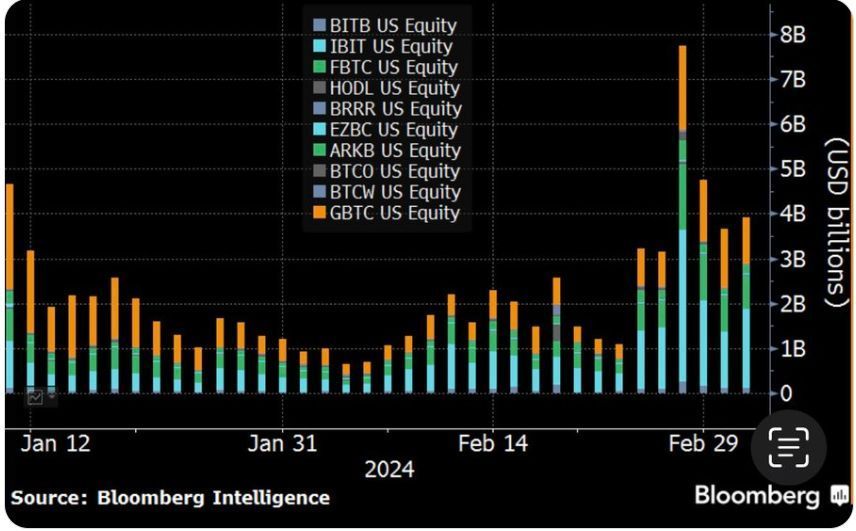 Kể từ sau khi được phê duyệt đến nay, khối lượng giao dịch các quỹ Bitcoin ETF giao ngay thường xuyên biến động dưới 2 tỷ USD. Nhưng cho đến cuối tháng 2 đầu tháng 3, khối lượng ghi nhận khuynh hướng tăng mạnh.