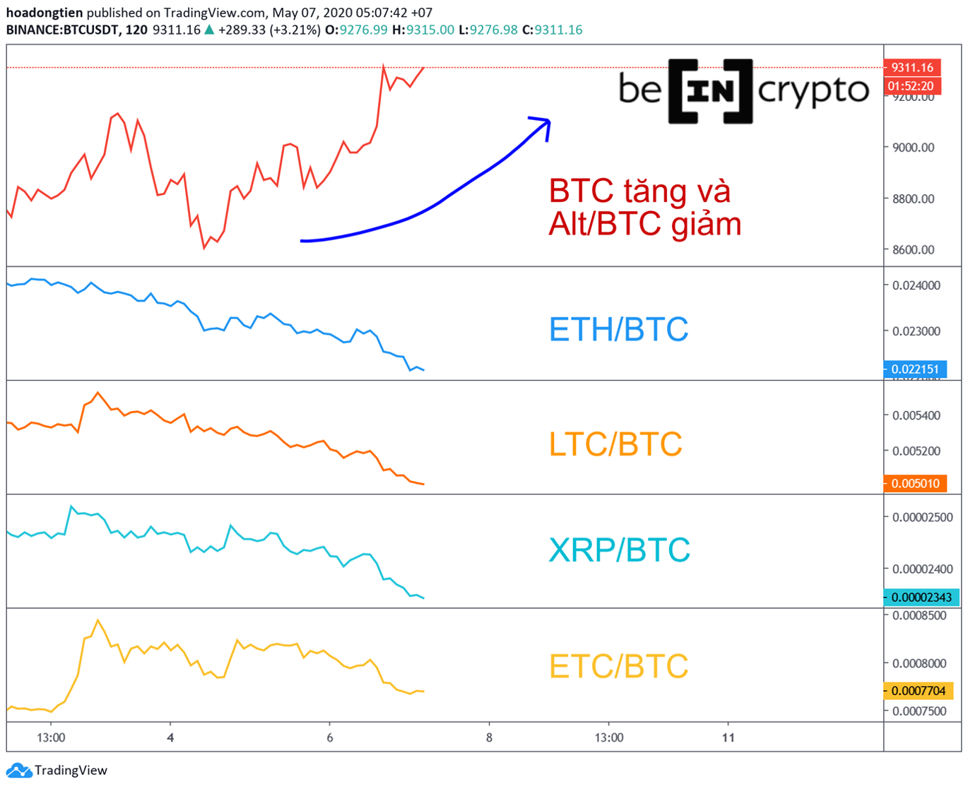 Alt/BTC ngược chiều hoàn toàn với Bitcoin. Người ta đang bán chỗ Alt mà nó nắm giữ ra Bitcoin. Alt/BTC đã không mấy khả qua trong suốt thời gian qua, Bitcoin bật tăng gần đây cũng chỉ làm cho Alt/BTC càng tồi tệ thêm. Nếu bạn nắm giữ Alt/BTC, thì gần như khó mà có lãi, hoặc may mắn sẽ hều vốn nếu bán ra Bitcoin với mức giá đã tăng này.