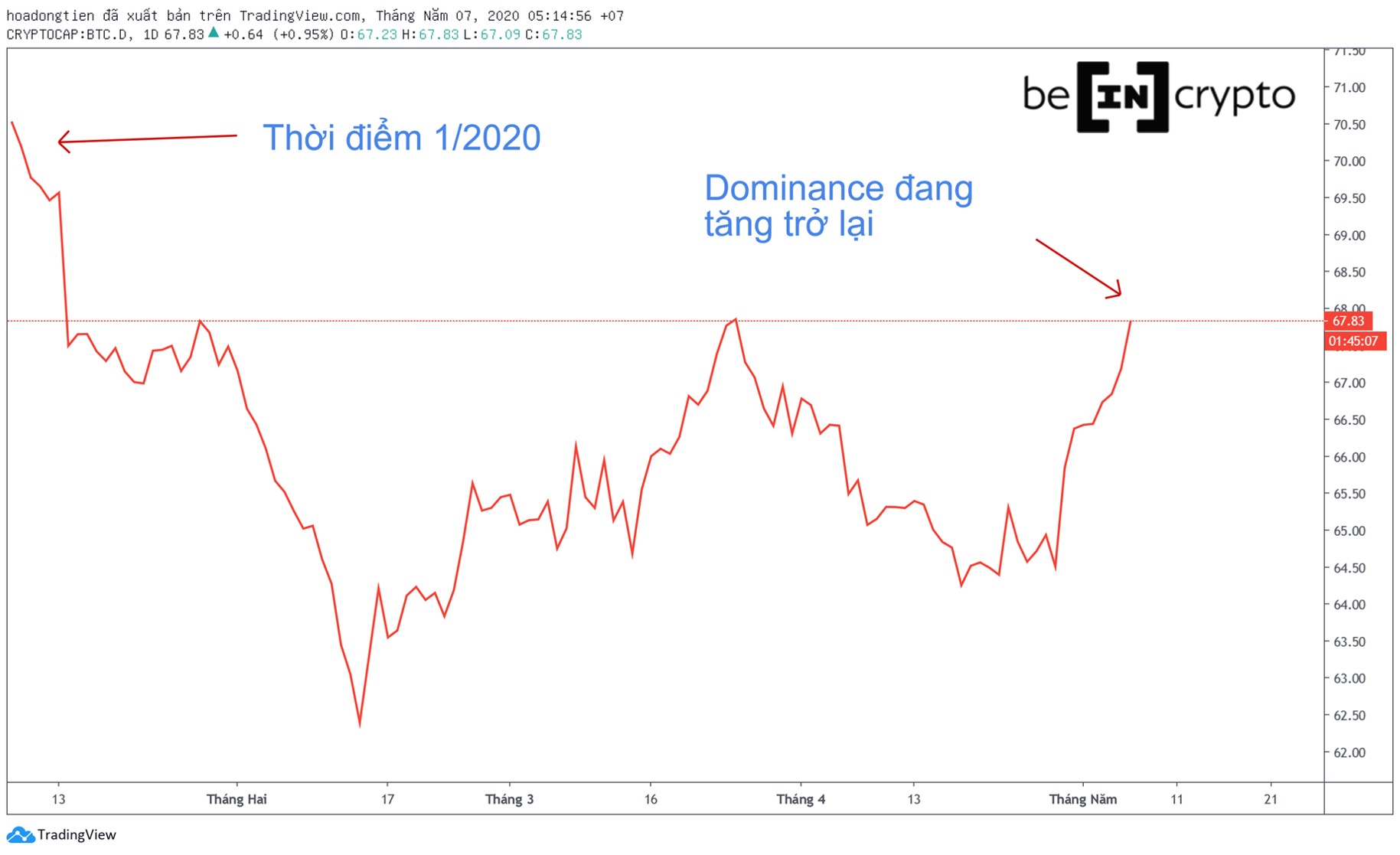 Để bổ sung thêm dữ liệu cho suy luận, cùng quan sát Dominance của Bitcoin. (hay có thể hiểu như thị phần của Bitcoin trong thị trường)