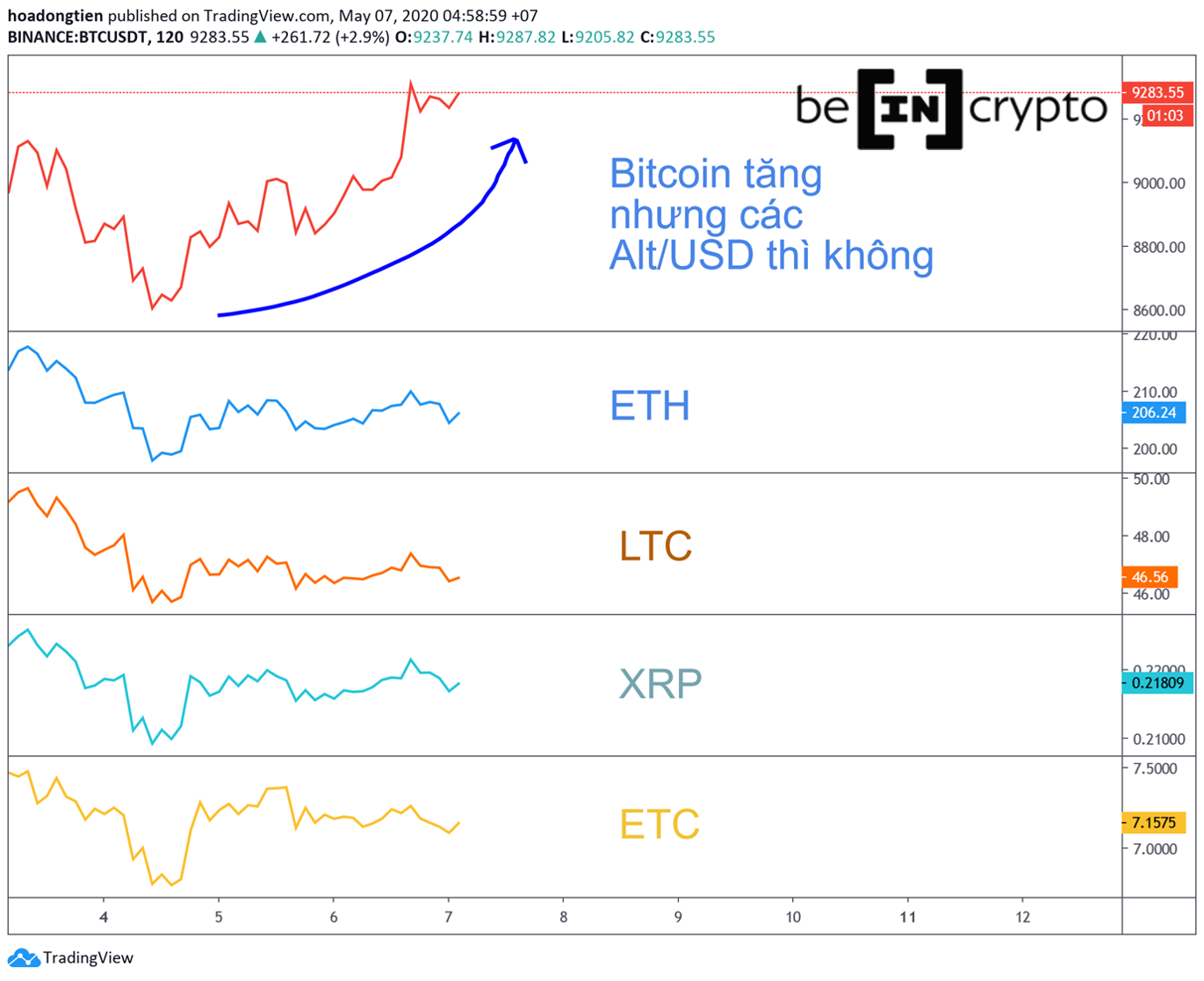 Cùng quan sát và so sánh biến động của Bitcoin với các cặp Alt/USD
