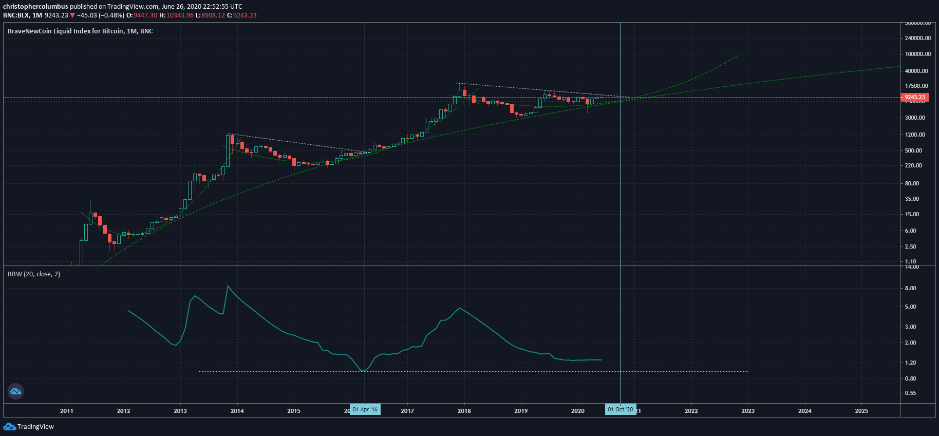 Qua biểu đồ cho thấy, dải Bollinger vẫn chưa đạt đến mức độ được nhìn thấy vào lúc khởi đầu của thị trường giá tăng năm 2016, mà đã đưa BTC lên đến đỉnh 20.000 USD.