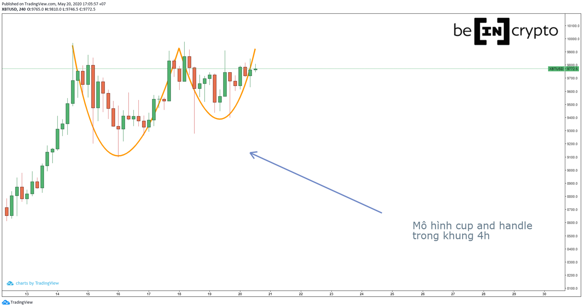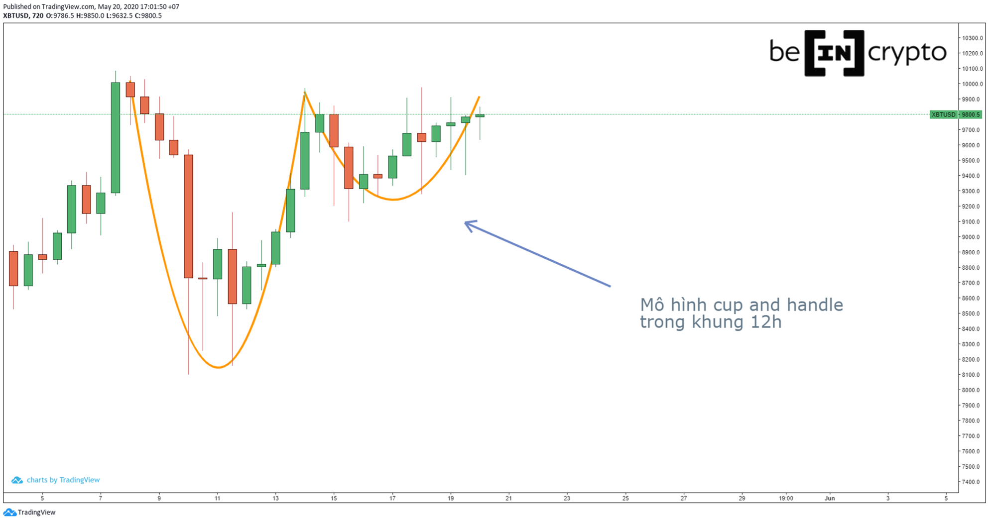 Trong khung 12 giờ, bạn sẽ dễ dàng nhận ra một mô hình cup and handle.
