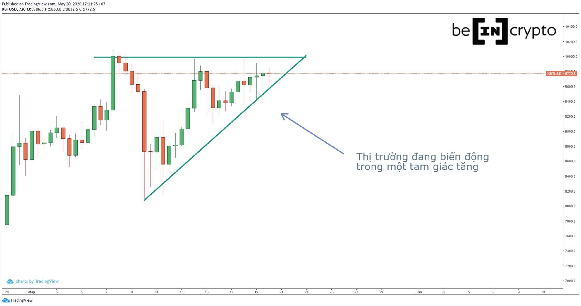 Nếu quan sát biểu đồ giá Bitcoin hiện tại, thì hành vi giá đã tạo nên nhiều mô hình dự báo Bitcoin sẽ còn tiếp tục tăng. Đặc biệt là sự xuất hiện của hai mô hình cốc và tay cầm, và mô hình tam giác tăng.