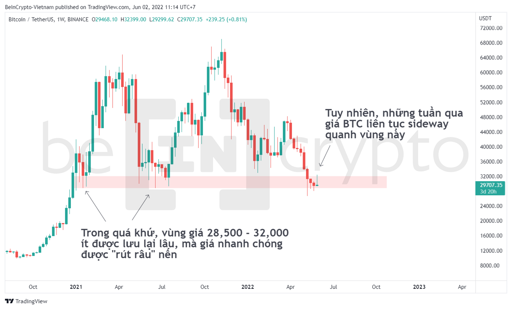 - Nhưng năm 2022 thì hoàn toàn ngược lại, giá Bitcoin thậm chí bị “nhốt” trong biên độ 28,500 USD – 32,000 USD nhiều tuần liền chưa thể nào thoát ra được.