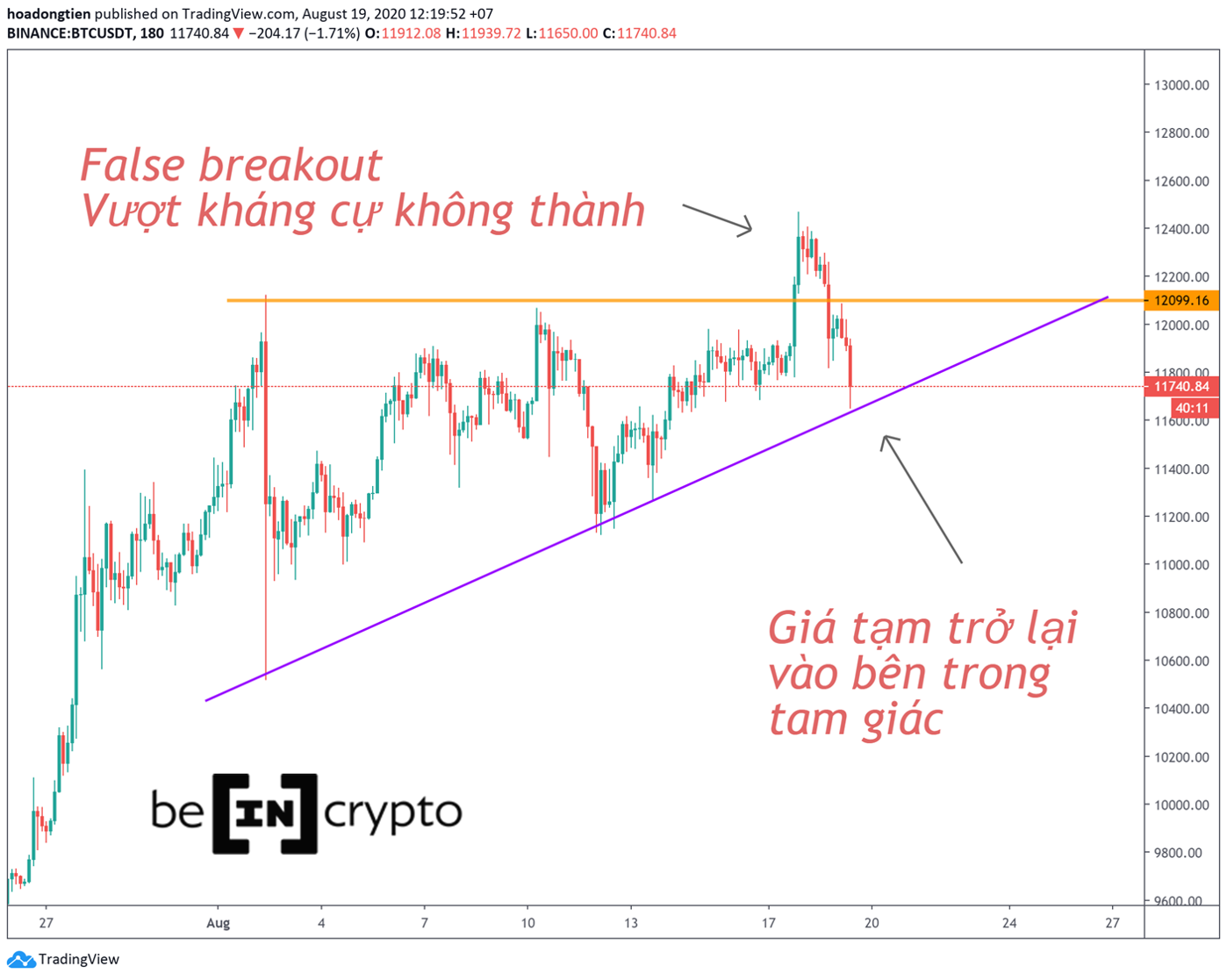 Cú “false breakout” vừa rồi có lẽ là điều mà các trader đánh lên không mong đợi nhất. Thông thường, khi đi trong một tam giác tăng như thế này, kế hoạch target sẽ đạt đến mức 13.000 ~ 14.000 đô la. Nhưng giá đã quay lại bên trong tam giác.