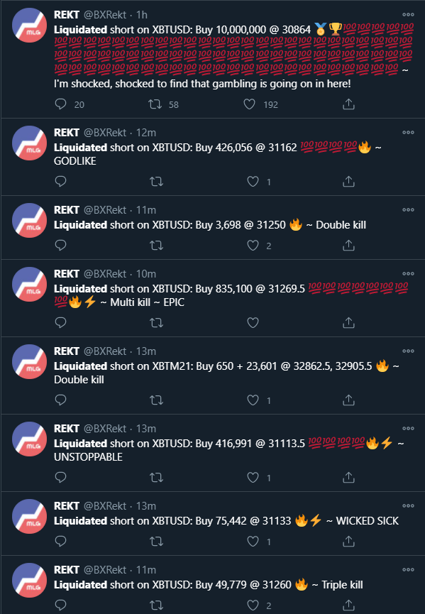 Một bot theo dõi các lệnh thanh lý trên giao dịch phái sinh BitMex đã cho biết: cho đến hơn 10 triệu đô bị thanh lý vì bán khống Bitcoin. Ngay khi thời điểm Bitcoin bật tăng. Đây quả mà một trận đặt cược cực lớn một biến động điên rồ.