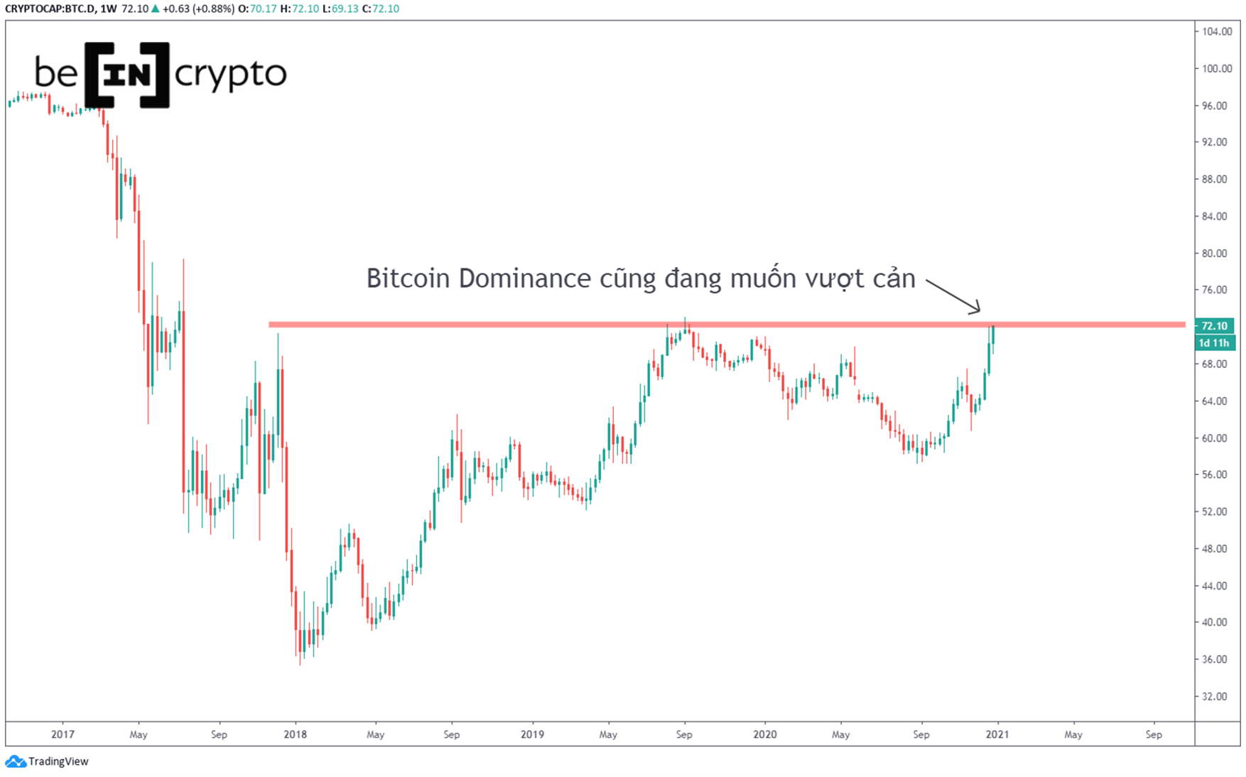 Vùng 71~72% là vùng cản của Bitcoin Dominance. Nếu giá cứ tiếp tục tăng, thì rất có thể Bitcoin Dominance sẽ vượt qua vùng cản từ rất lâu này.