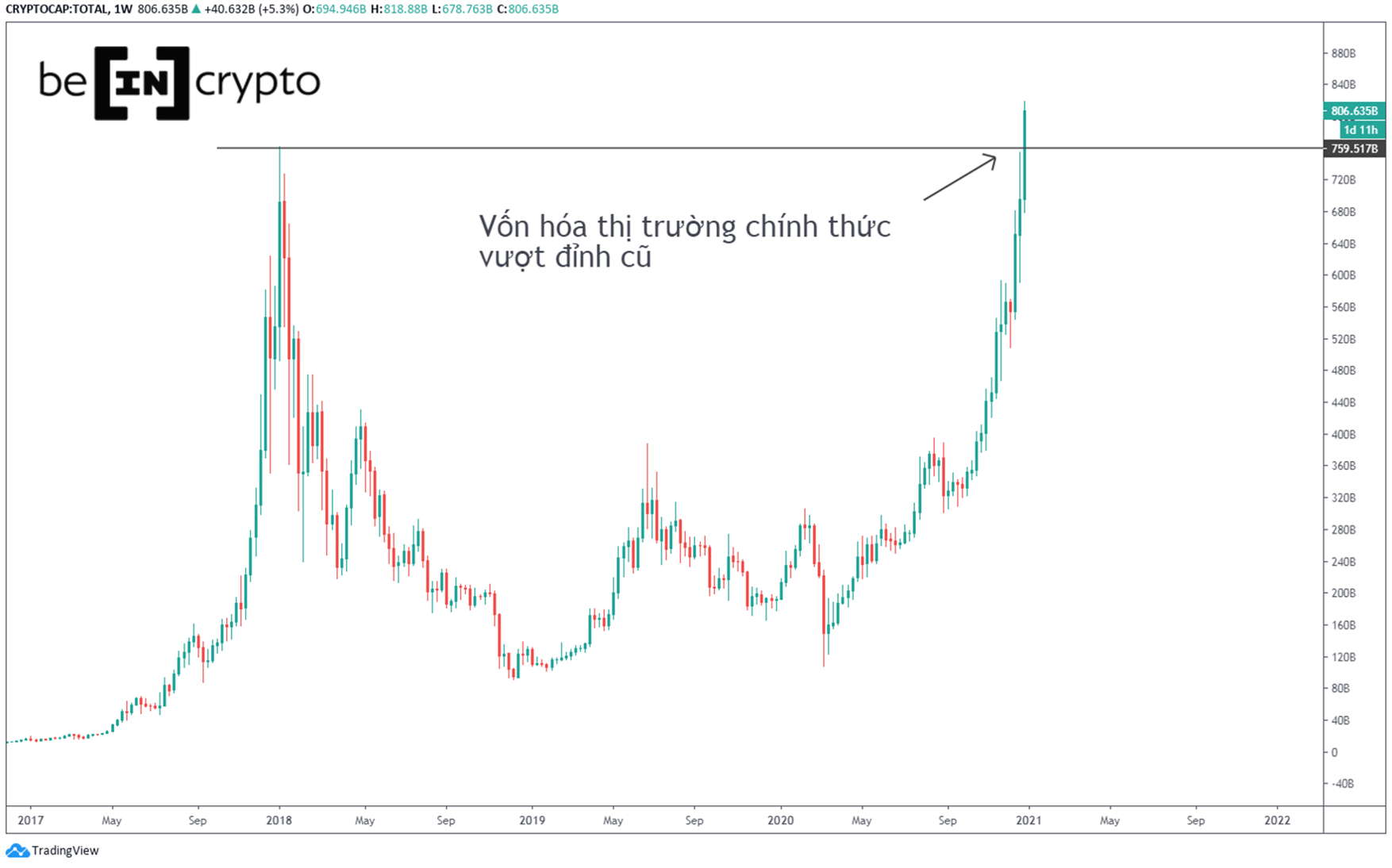 Ngoài ra, nếu so sánh với đỉnh vốn hóa toàn thị trường năm 2017 chỉ chưa tới 800 tỷ, thì hiện tại vốn hóa toàn thị trường đã chính thức vượt mức 800.