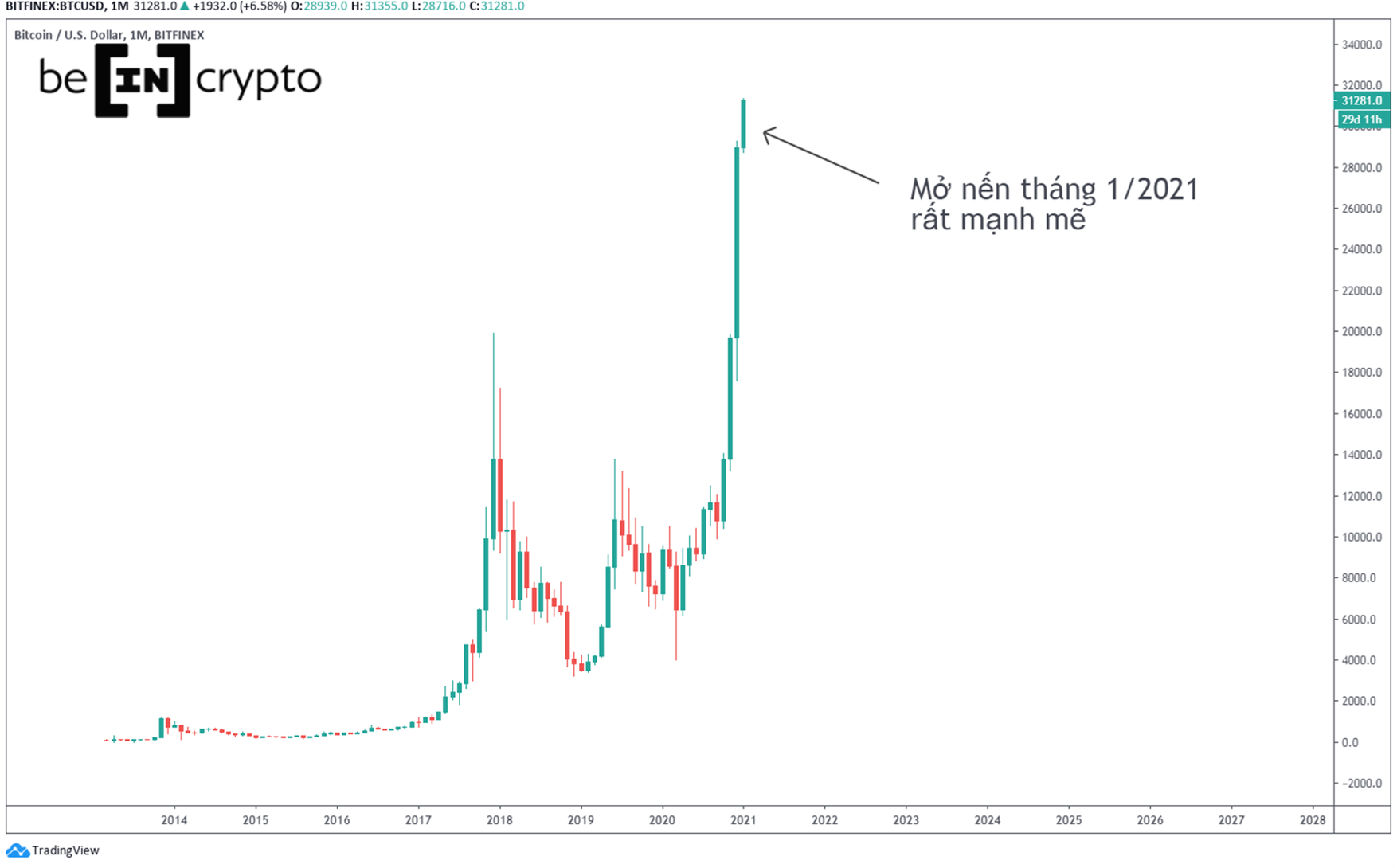 SponsoredNến tháng 1/2021 đã mở cửa, và mà một cây nến xanh rất mạnh mẽ. Chưa hề có một dấu hiệu đảo chiều rõ rệt nào. Gần đây, chúng tôi cũng đã có một bài phân tích, có thể đỉnh của đợt uptrend này sẽ rơi vào mốc giá khoảng 35.000 đô la. (đo theo fibonacci).