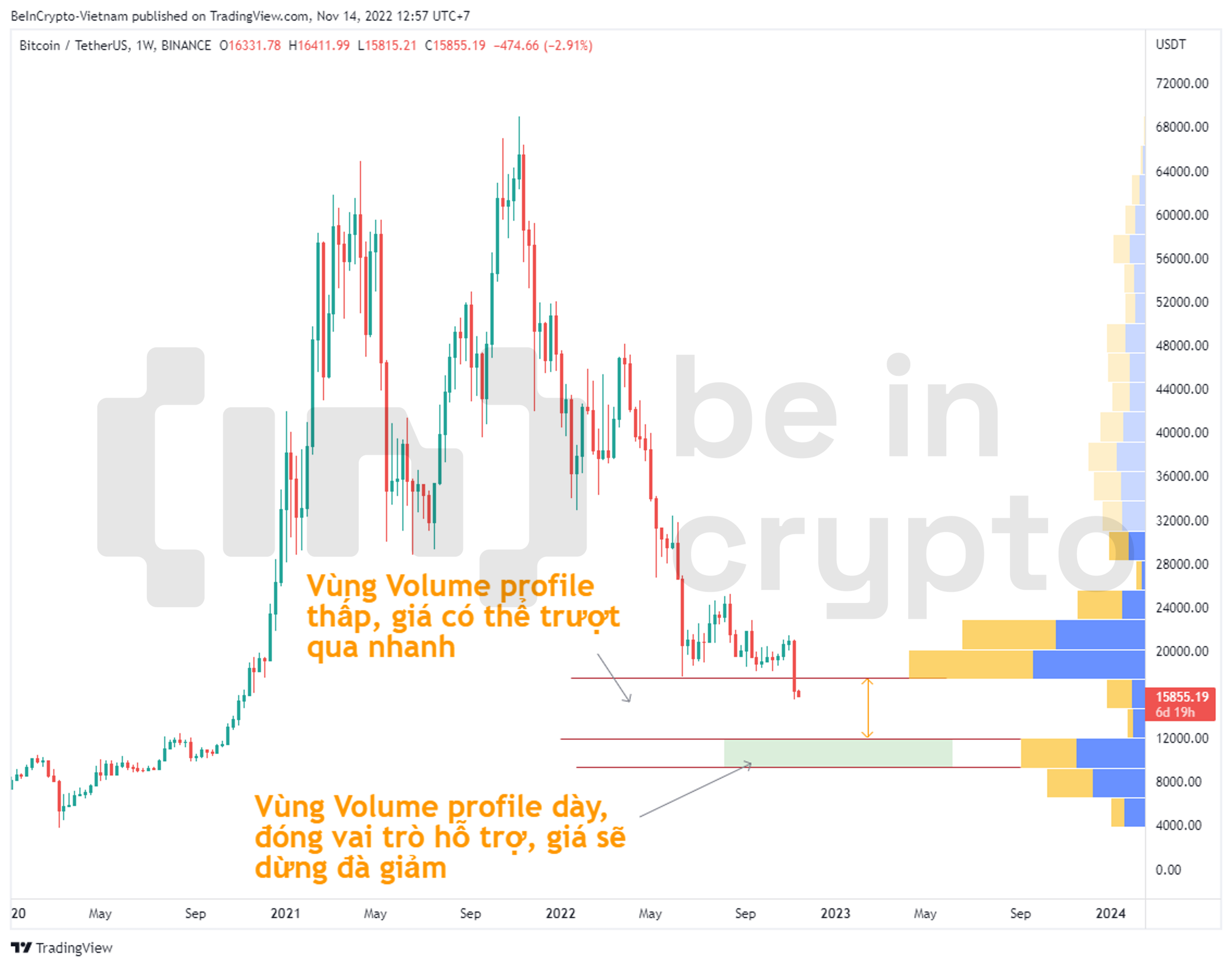 - Khi về dưới 16,000 USD, BTC đang biến động vào vùng giá có dữ liệu Volume Profile thấp. Số đông thị trường ít giao dịch tại đây trong quá khứ. Nên có khả năng giá sẽ di chuyển rất nhanh qua vùng này. Đây là vùng FOMO cuối năm 2021, cũng có thể là vùng PANIC cuối năm 2022.