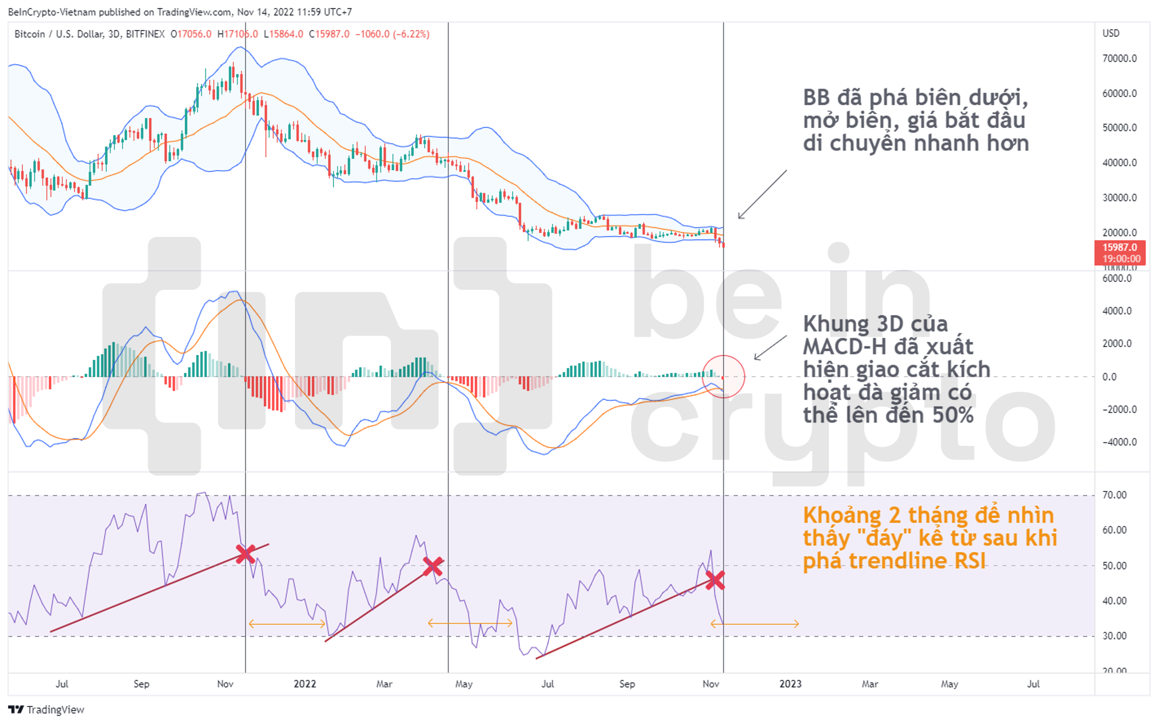 Khung 3 ngày (3D) có hai tín hiệu kỹ thuật quan trọng được đề nghị nên theo dõi ngày từ tháng 10. Đó là giao cắt MACD-H và RSI. Cả hai tín hiệu kỹ thuật này này đều đã xuất hiện vì đà giảm của BTC gần đây.