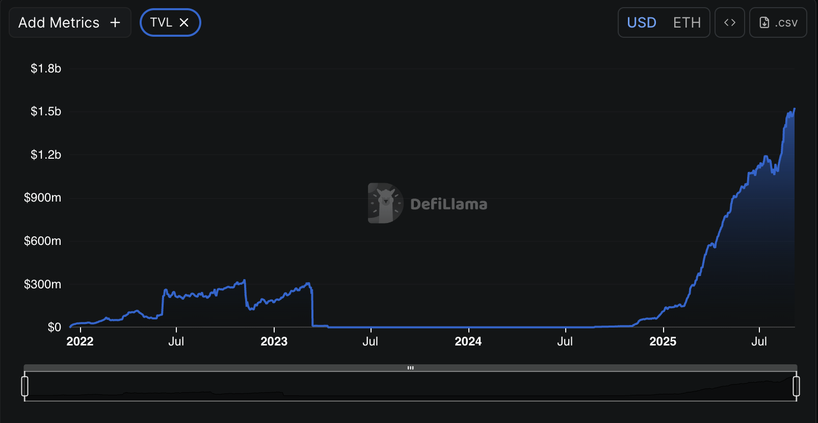 Bên cạnh giá cả, bản thân mạng lưới cũng đã chứng kiến sự tăng trưởng đáng kể. Dữ liệu từ DefiLama tiết lộ rằng TVL của Euler đã đạt mức cao nhất mọi thời đại (ATH) mới là 1.52 tỷ USD hôm nay. Điều này đại diện cho mức tăng gần 15 lần kể từ đầu năm 2025.
