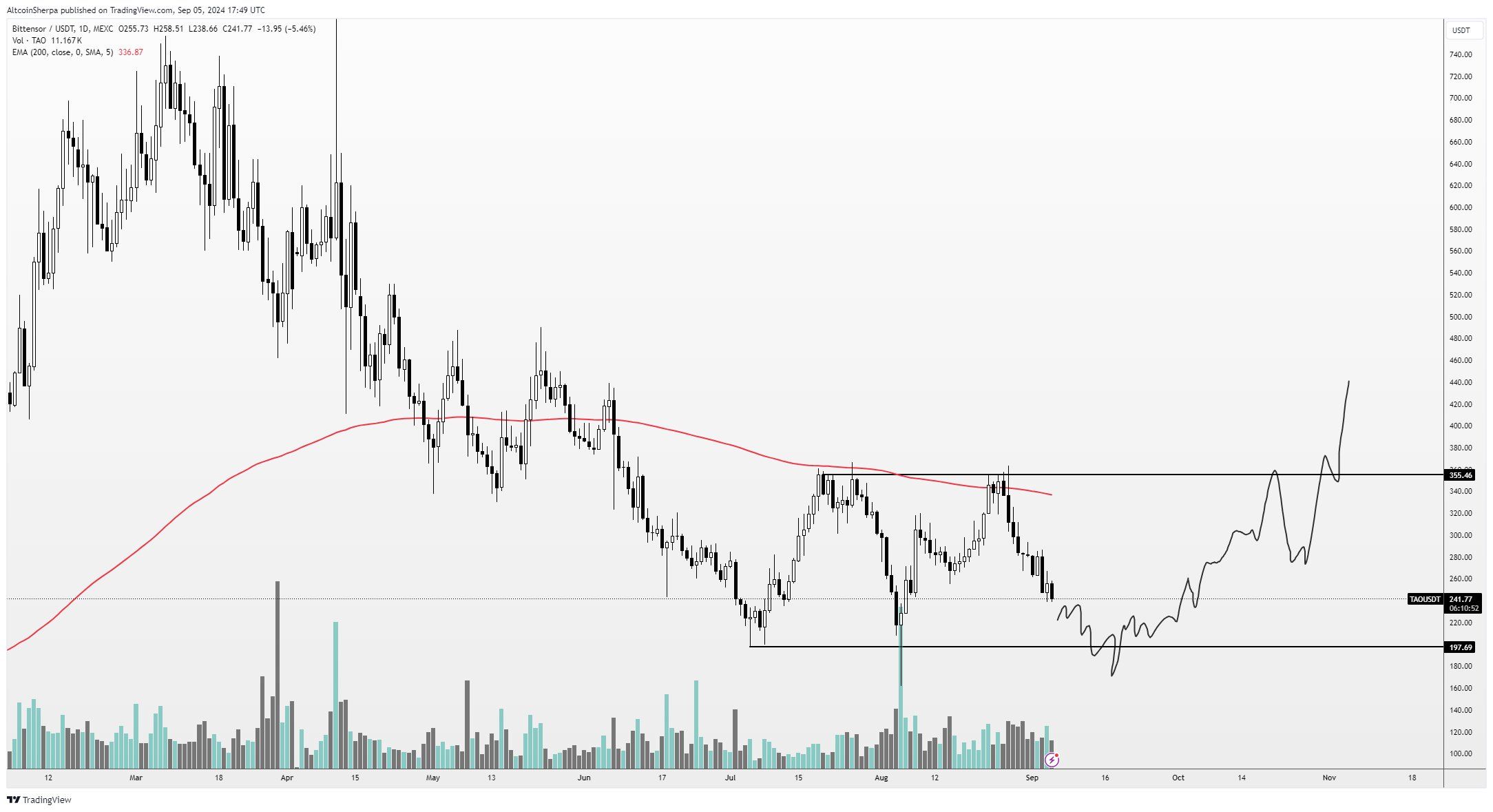Quan sát trên cho thấy, 200 USD vùng giá hỗ trợ quan trọng nhất trong năm 2024 của TAO. Dưới mức giá này, có thể khiến kích hoạt tâm panic sell. Trong năm 2024, đã 3 lần giá TAO bật lên từ vùng 200 USD, nhưng hai lần gần đây đều bị bán mạnh khi giá tăng đến 360 USD. Dự đoán, giá TAO có khả năng tiếp tục giảm về hỗ trợ này và tranh chấp quanh 200 USD trong tháng 09.