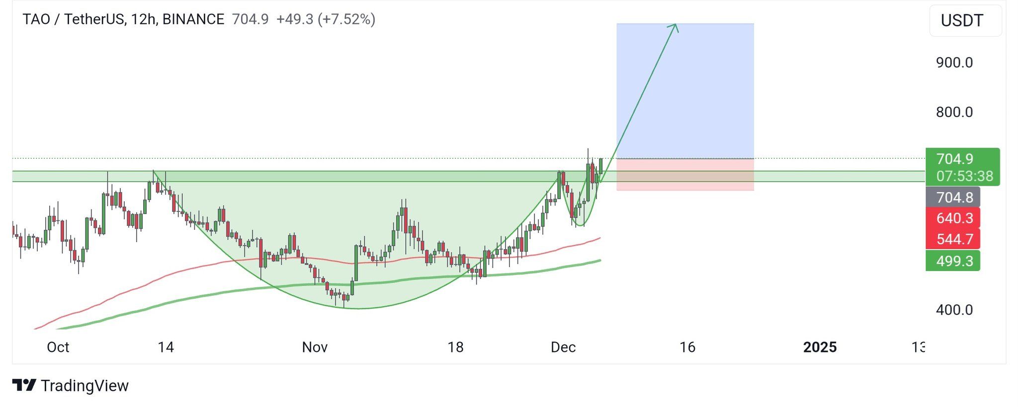 Trên mạng X, đa phần những quan sát kỹ thuật về giá TAO lúc này đều đang hướng đến kịch bản tăng giá với cơ sở là mô hình cốc và tay cầm. Quan sát của nhà đầu tư Cryptocandy24x cho thấy target của mô hình này là vùng 1,000 USD.