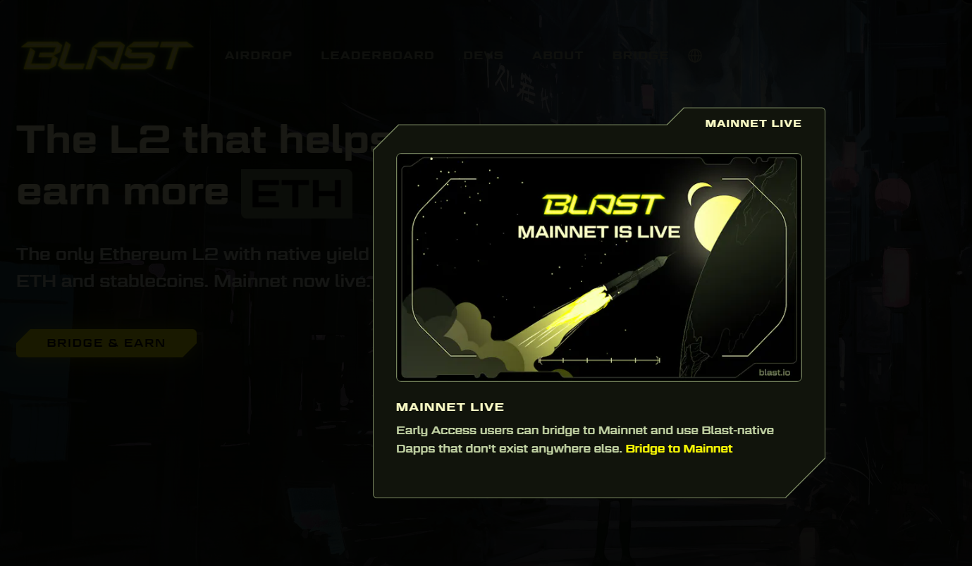 Blast, được tạo ra bởi Tieshun Roquerre, người sáng lập NFT Blur marketplace, nhằm mục đích cung cấp mô hình lợi nhuận gốc (native yield) cho Ethereum và stablecoin với mức lãi suất lần lượt là 4% và 5%. Theo dữ liệu được BeInCrypto ghi nhận từ trang web chính thức của nền tảng này, nhờ cung cấp quyền truy cập sớm cho một nhóm người dùng nhất định nên Blast đã thu hút gần 200,000 thành viên cộng đồng và đạt 2.3 tỷ USD tổng giá trị bị khóa (TVL).