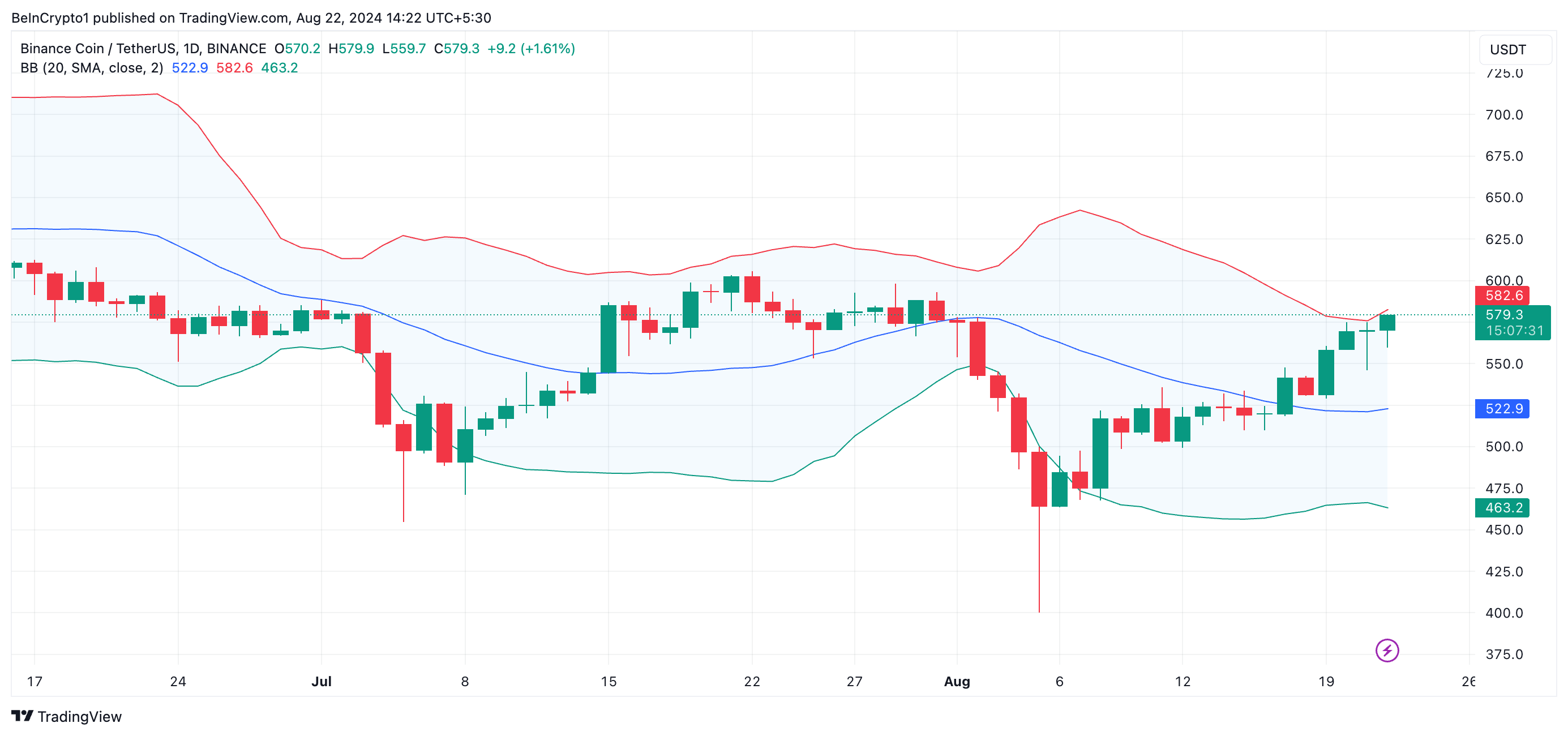 Mặc dù cấu hình kỹ thuật hiện tại của BNB là tăng giá, nhưng biên độ biến động thị trường tăng lên khiến nó có nguy cơ biến động theo cả hai hướng. Điều này được rút ra từ khoảng cách ngày càng rộng giữa các dải trên và dưới của chỉ báo Bollinger Bands (BB).