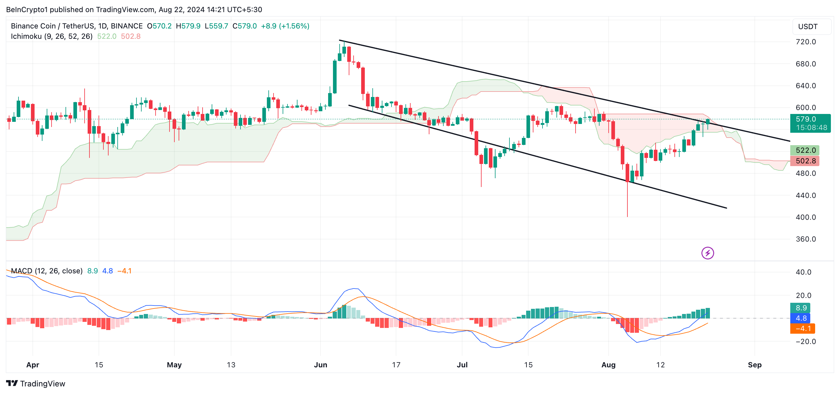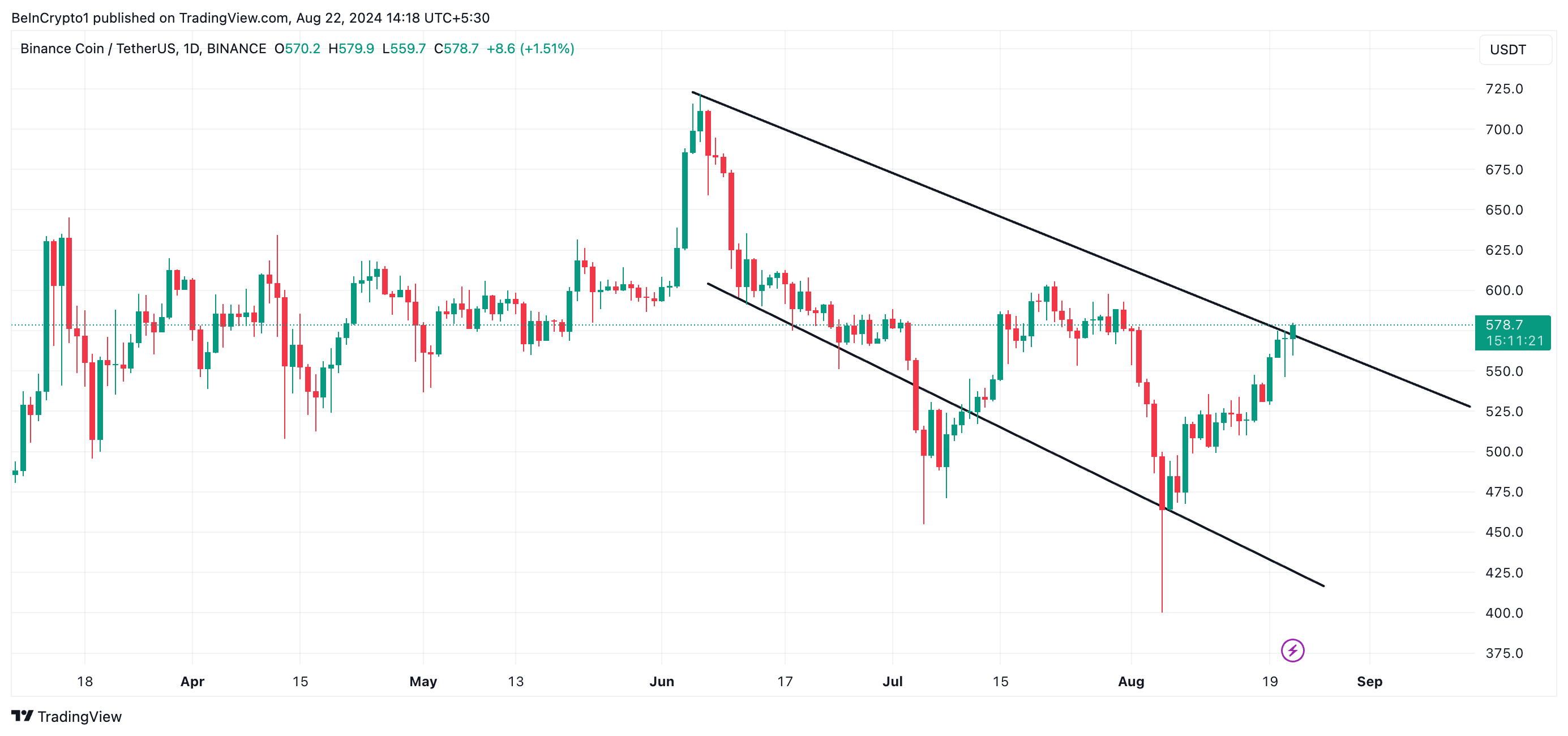 Kể từ khi nó bắt đầu xu hướng trong kênh này, giá BNB đã giảm 17%. Tuy nhiên, với xu hướng tăng mạnh đối với altcoin sau sự sụt giảm chung của thị trường vào ngày 05/08, BNB đến nay đã có dấu hiệu phá vỡ lên trên kênh giảm giá này.