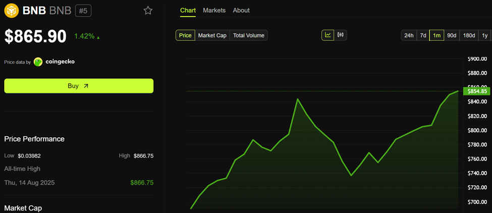 Tại thời điểm viết bài, giá BNB đang giao dịch ở mức 865.90 USD, tăng nhẹ 1.42% trong 24 giờ qua.