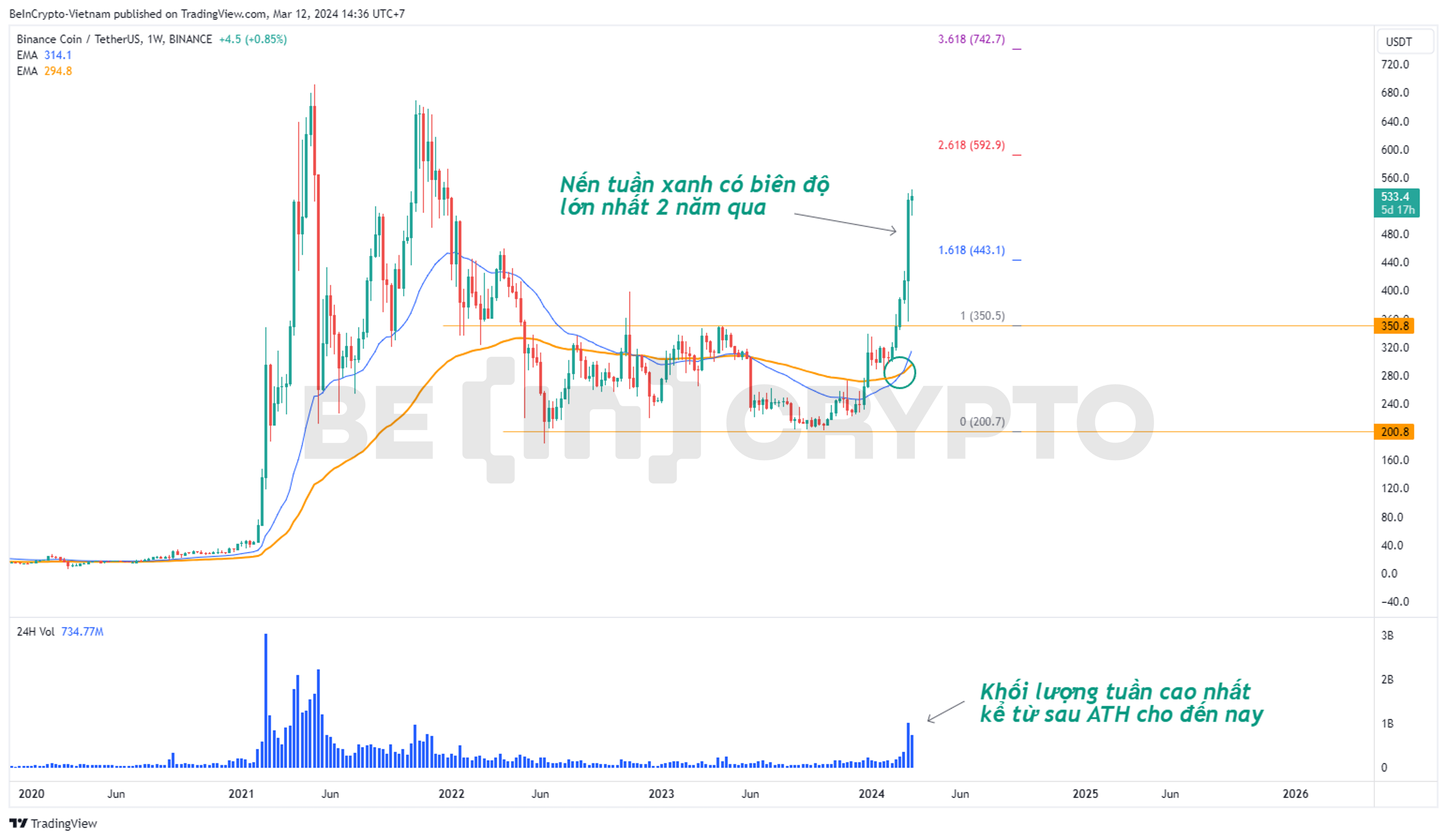 Bitcoin (BTC) đã thiết lập mức cao mới trên 72,000 USD và vẫn đang duy trì đà tăng. Trong khi Ethereum (ETH) chỉ còn cách đỉnh cũ thêm 19%, thì BNB vẫn còn cách đỉnh cũ đến 28%. Tuy nhiên, BNB vừa ghi nhận một nến tuần có biên độ đến 180 USD, là nến tuần biên độ lớn nhất kể từ sau ATH đến nay.
