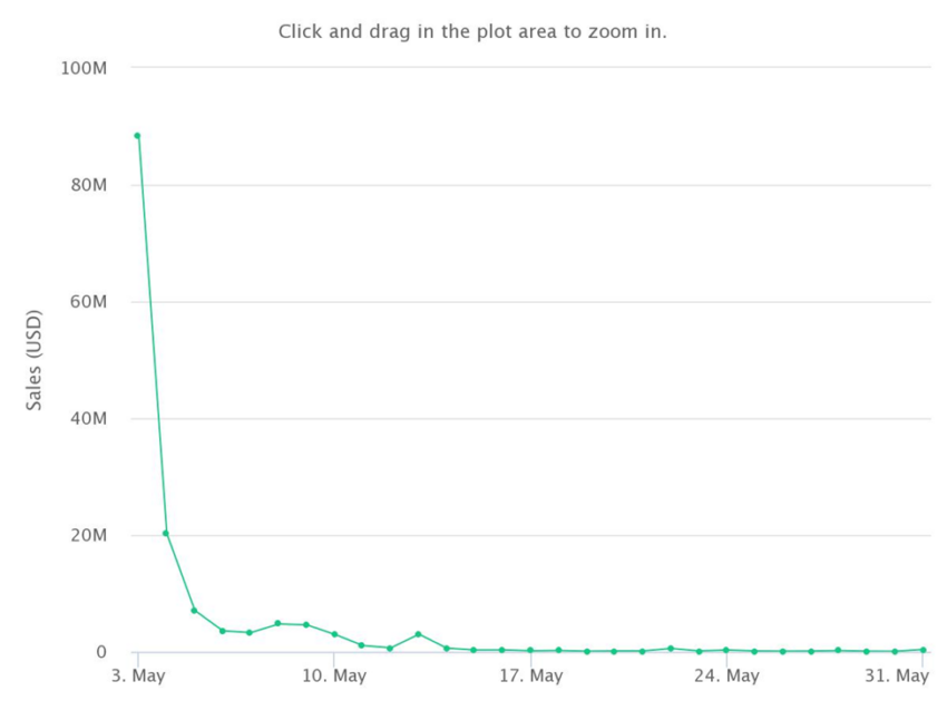 Nhìn vào sự gia tăng đột biến về số lượng người mua từ tháng 5 năm 2021, doanh số bán hàng tăng vọt dẫn đến số lượng giao dịch tăng dần của nền tảng với 3,988 người mua và 12,972 giao dịch. Doanh số bán hàng của Meebits đạt 143.29 triệu USD vào cuối tháng.