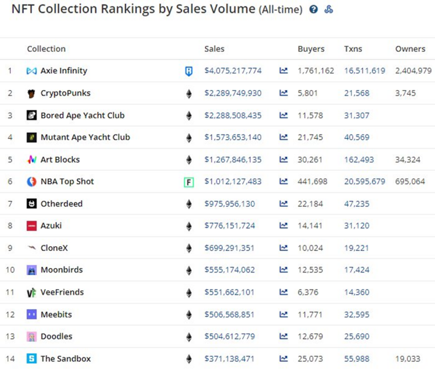 Ngoài Meebits, các dự án NFT đang chạy đã đạt doanh số bán hàng cao nhất bao gồm Axie Infinity, VeeFriends, Mutant Ape Yacht Club (MAYC), CryptoPunks, Bored Ape Yacht Club (BAYC), The Sandbox và NBA Top Shot, trong số những dự án khác.