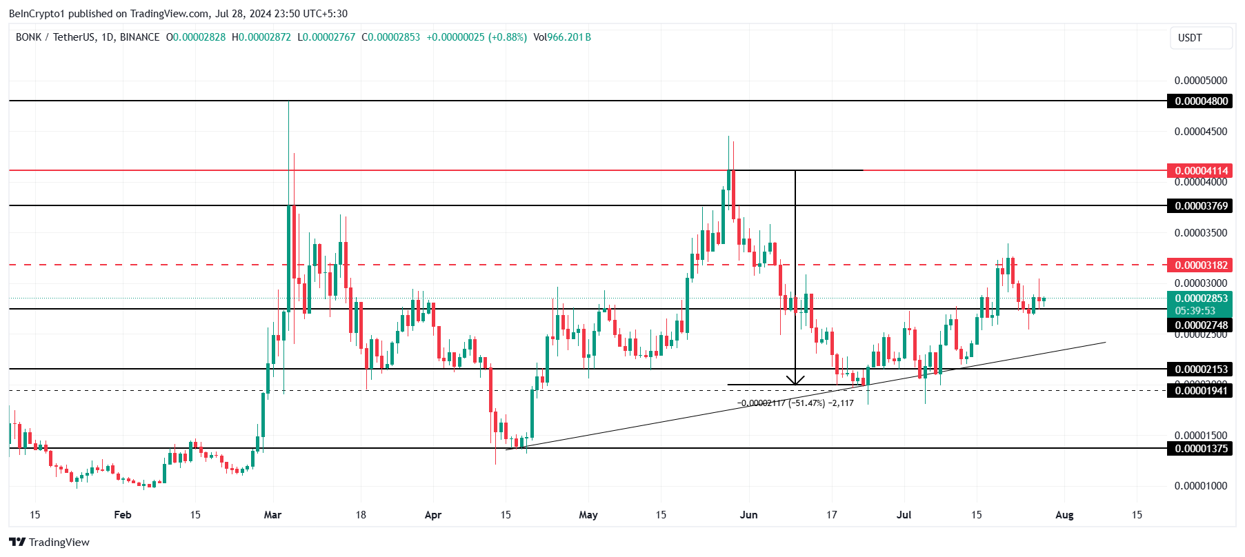 Giá BONK hiện tại là 0.00002853 USD đang dưới ngưỡng kháng cự 0.00003182 USD, cố gắng duy trì trên mức hỗ trợ 0.00002748 USD. Cấu trúc giá này là nhờ BONK đã duy trì xu hướng tăng từ giữa tháng Tư và vẫn đang tiếp tục xu hướng đó.