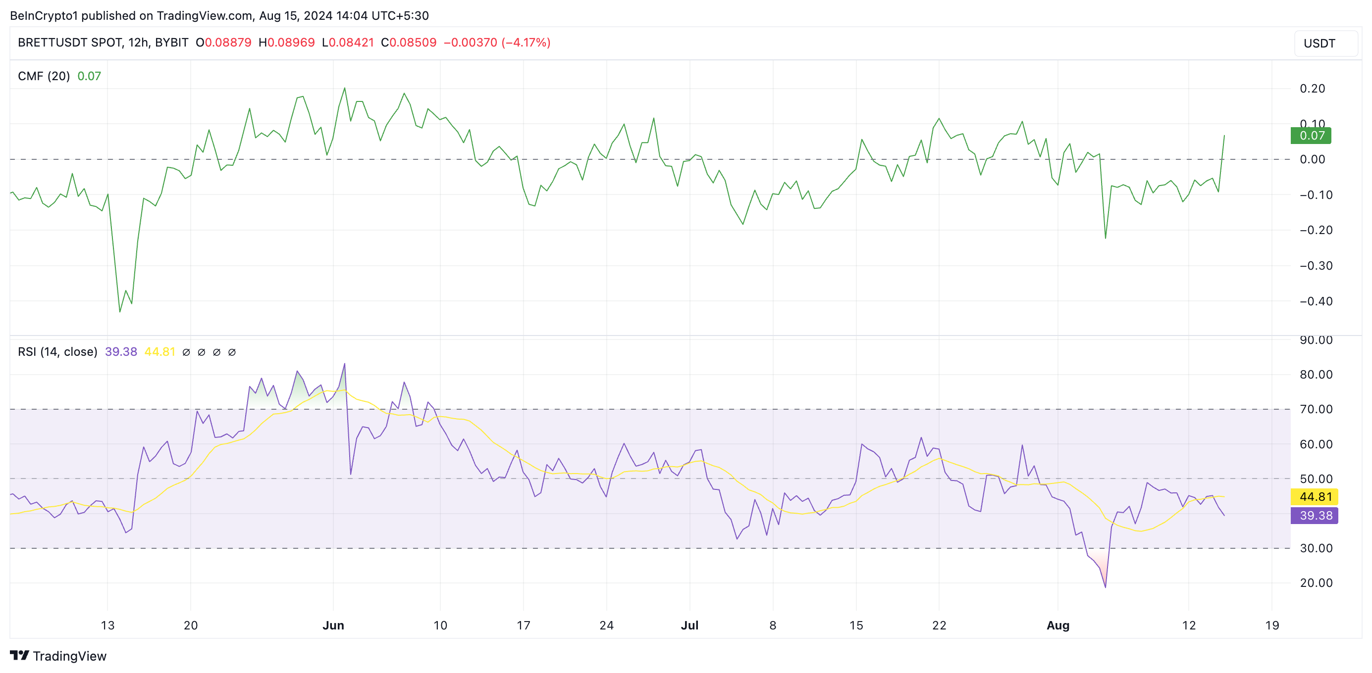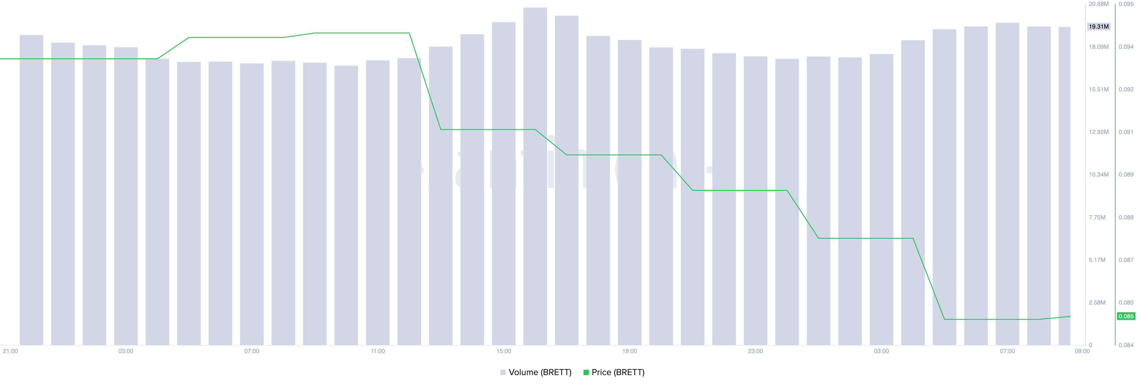 Hiện tại, BRETT đang được giao dịch ở mức 0.085 USD, giảm gần 10% trong 24 giờ qua. Trong khoảng thời gian tương tự, khối lượng giao dịch của nó đạt 19 triệu USD, tăng 13%. Sự phân kỳ giữa giá và khối lượng cho thấy các nhà đầu tư đang bán tháo vị thế của mình. Tuy nhiên, điều này cũng báo hiệu rằng thị trường có thể đang tiến đến một điểm nghịch chuyển nơi áp lực bán có thể giảm bớt. Tại giai đoạn này, sự quan tâm của người mua thường xuất hiện trở lại, có thể dẫn đến sự phục hồi giá.