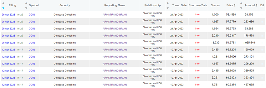 Theo dữ liệu của dataroma, Armstrong đã bán 59,460 cổ phiếu với giá 3.46 triệu USD trong 11 giao dịch diễn ra từ ngày 12/4 đến ngày 26/4. Phân tích cụ thể cho thấy Armstrong đã bán 29,730 cổ phiếu với giá 1.86 triệu USD trong 6 giao dịch vào ngày 10/4 trước khi thực hiện thêm 5 giao dịch vào ngày 24/4 .Trước đây, CEO của Coinbase đã bán 89,196 COIN trị giá 5.8 triệu USD vào tháng 3.