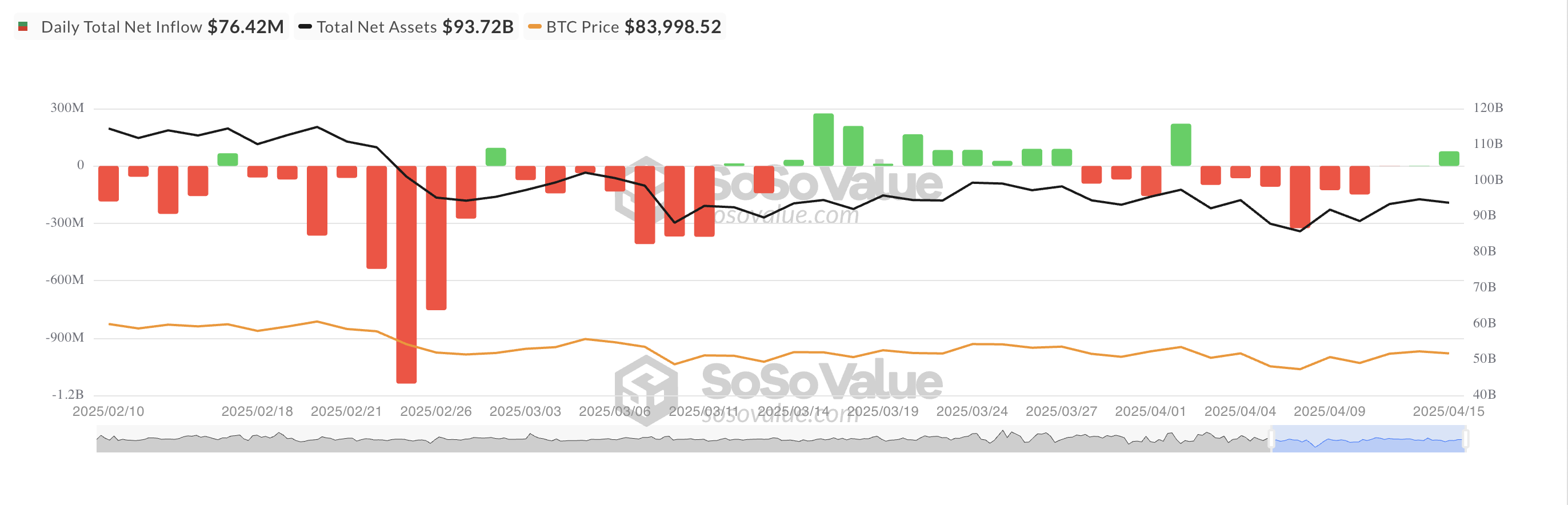 Các quỹ ETF Bitcoin giao ngay đã ghi nhận ngày thứ hai liên tiếp có dòng tiền ròng vào vào thứ Ba, với tổng số tiền là 76.42 triệu USD.