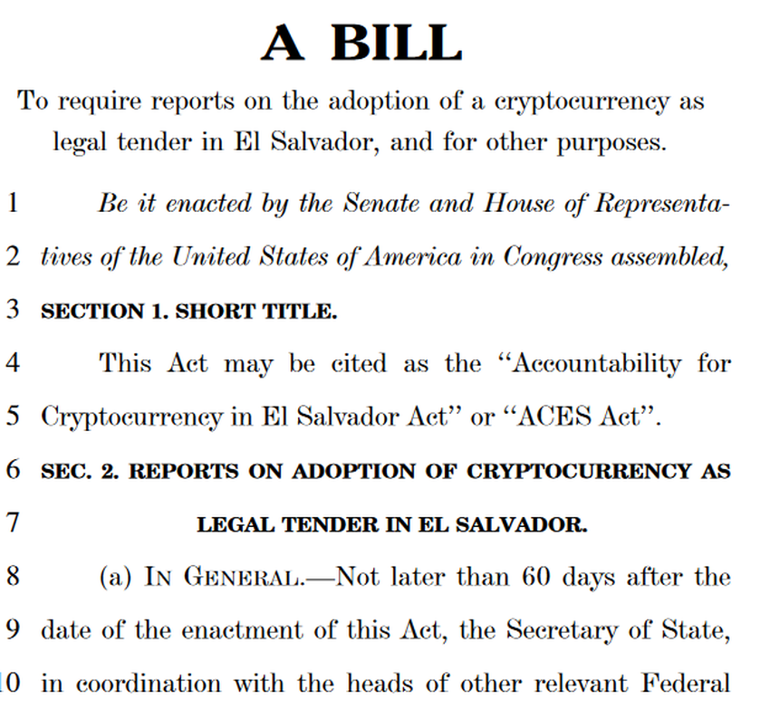 “Yêu cầu” vừa được đưa ra của Thượng viện là sự tiếp nối của đề xuất được gọi là “Luật trách nhiệm đối với tiền điện tử ở El Salvador”, hay “Đạo luật trách nhiệm đối với tiền điện tử ở El Salvador (ACES)” bằng tiếng Anh. Theo Nayib Bukele, chính phủ Hoa Kỳ đang thực hiện biện pháp này vì lo ngại về các dự án đang được thực hiện bằng Bitcoin.