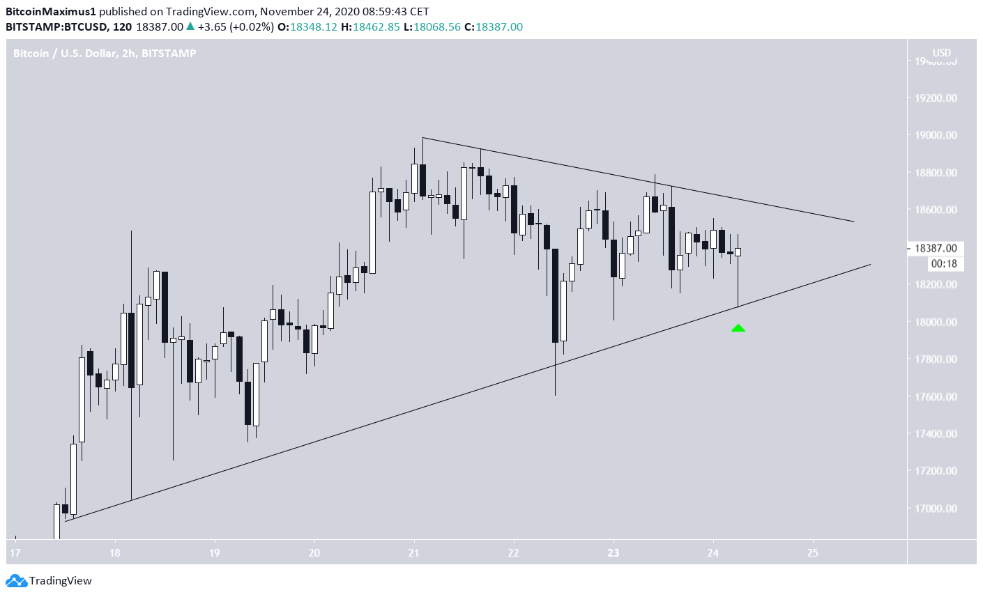Như đã nói ở trên, kể từ khi đạt mức cao nhất là $18.977 vào ngày 21 tháng 11, giá BTC vẫn đang được giao dịch trong một mô hình tam giác cân. Hôm nay (24/11), giá của nó đã giảm xuống đường hỗ trợ của tam giác và tạo ra một bấc nến dài phía dưới, tạo thành hình cây búa (nến hammer). Đây là dấu hiệu khi xuất hiện áp lực mua.