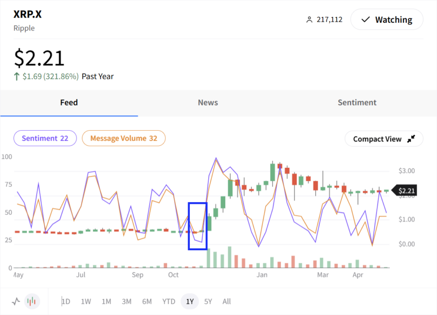 Dữ liệu tâm lý xã hội của Stocktwits là một công cụ mạnh mẽ khác khi cố gắng mua XRP ở đáy. Stocktwits thu thập thông tin độc quyền từ các nhà giao dịch và nhà đầu tư – không có những cuộc trò chuyện ngẫu nhiên từ mạng xã hội chung.