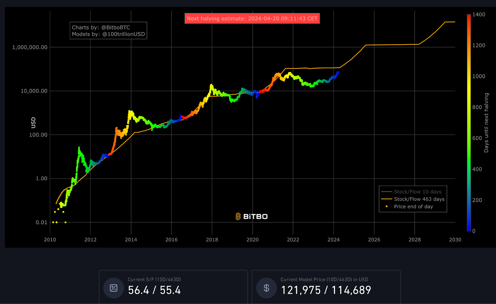 Cũng trong báo cáo của mình, Bybit có nhắc đến mô hình Stock-to-Flow (S2F). Theo đó, tỷ lệ S2F của Bitcoin là 56 được thiết lập tăng gấp đôi lên là 112 sau sự kiện Halving. Nó trái ngược với mức chỉ 60 của vàng. Điều này phần nào nhấn mạnh sự khan hiếm ngày càng tăng của Bitcoin mà tác nhân chính là các nhà đầu tư tổ chức, đặc biệt là ở Hoa Kỳ với sự chấp thuận của Bitcoin Spot ETF.