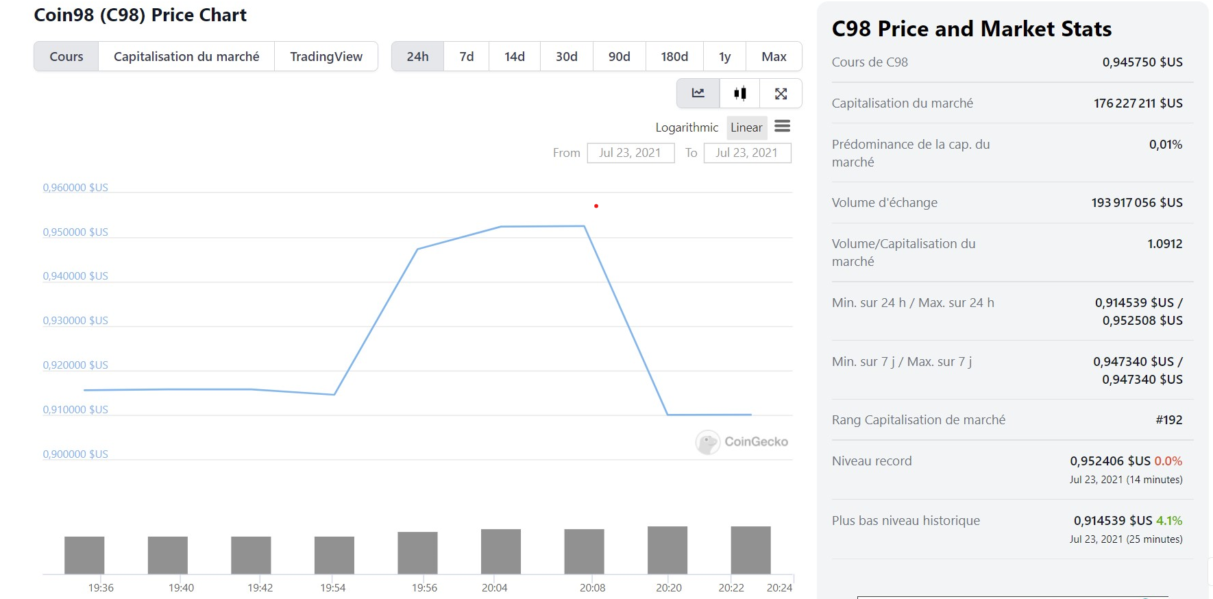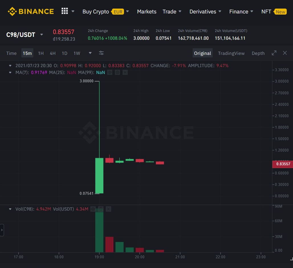 Vào khoảng gần 19:00 ngày 23/07, mã thông báo của Coin98 vừa niêm yết. Chỉ trong 15 phút vừa list sàn, C98 đã x40 lần, từ giá niêm yết là 0.075 USD đột phá lên mức 3 USD. Chính sự bứt phá này đã khiến tổng vốn hóa pha loãng của Coin98 dao động ở mức gần 1 tỷ USD.