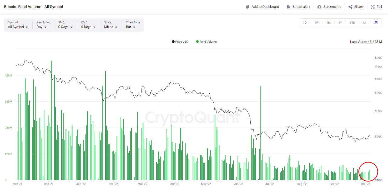 SponsoredTuy nhiên, dữ liệu từ CryptoQuant cho thấy, khối lượng giao dịch Bitcoin từ các quỹ/tổ chức trong tháng 9 và đầu tháng 10 giảm đáng kể và không có dấu hiệu tăng. Như vậy, tình trạng sideway hiện tại có thể không đơn thuần là trạng thái giao dịch giữa các nhà giao dịch nhỏ lẻ, mà sự lưỡng lự đó còn lây lan sang các quỹ lớn.