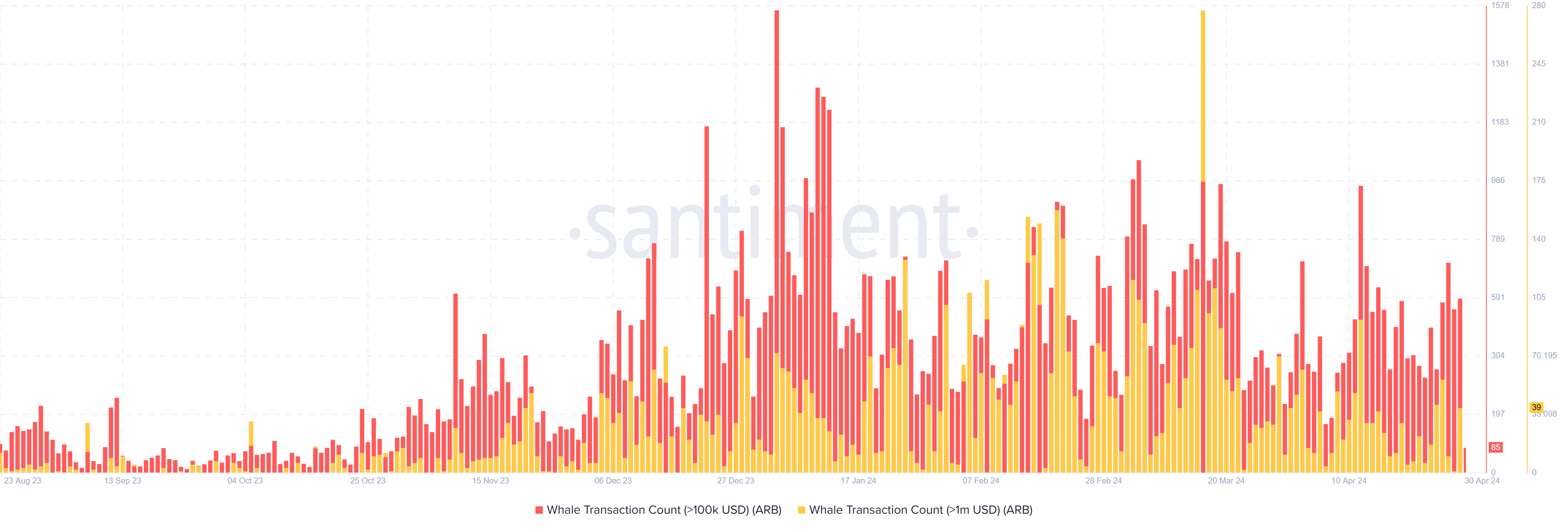 Trong vài tuần qua, các giao dịch trị giá hơn 100,000 USD và 1 triệu USD luôn ở mức cao. Sự tích lũy này có thể ngăn chặn sự sụt giảm giá của Arbitrum xuống dưới 1.00 USD.