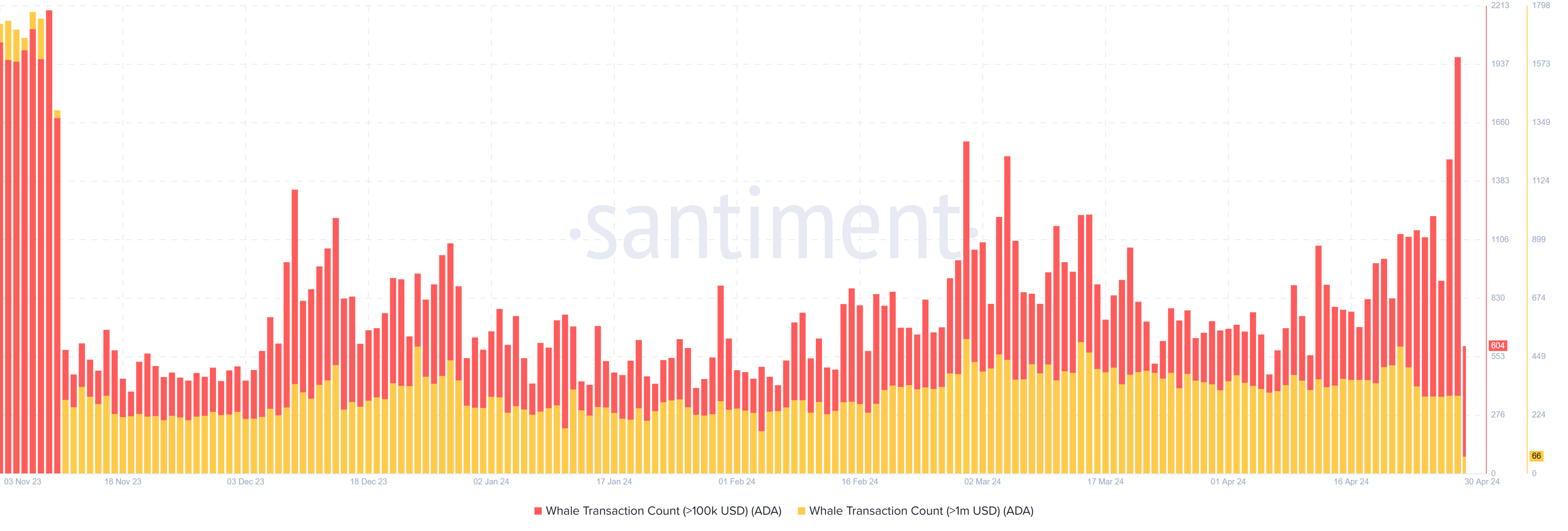 Cardano đã ghi nhận sự tích lũy ngày càng tăng dưới bàn tay của cá voi kể từ tháng 11/2023. Chuỗi mua này ghi nhận sự gia tăng đột ngột trong vài ngày qua khi các giao dịch trị giá hơn 100,000 USD, thường liên quan đến các giao dịch cá voi tiền điện tử, tăng vọt.