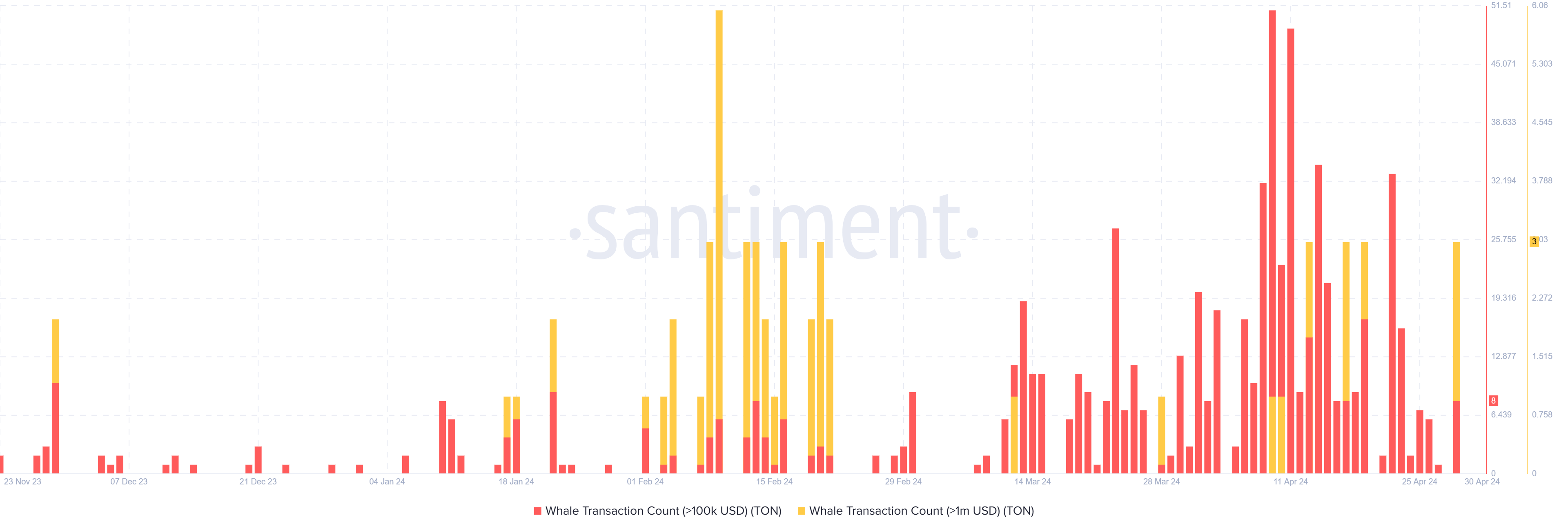 Kết quả là, cá voi đã nhảy vào để tận dụng bất kỳ đợt tăng giá nào có thể bằng cách tích lũy TON. Điều này có thể được ghi nhận trong sự gia tăng các giao dịch có giá trị hơn 100,000 USD và các giao dịch trị giá hơn 1 triệu USD.