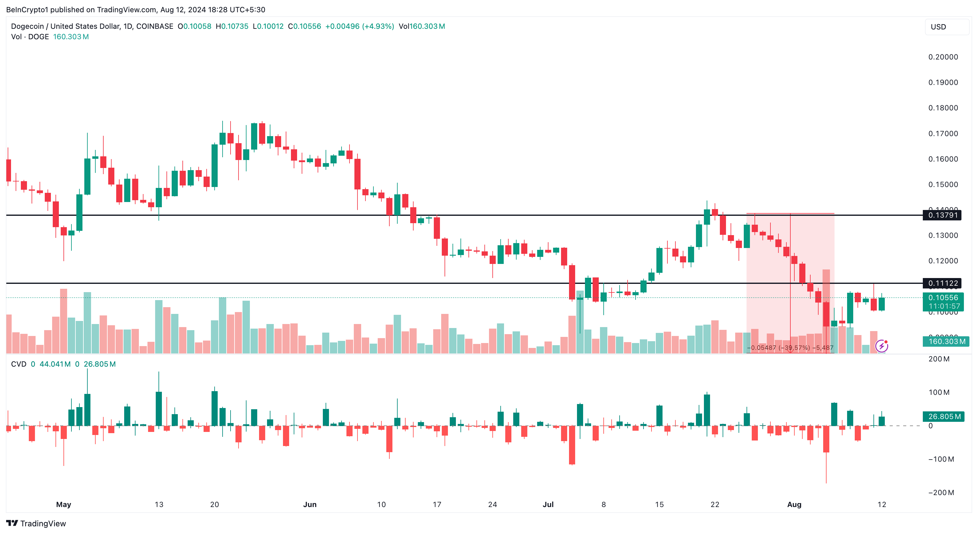 Trước khi DOGE tăng lên 0.10 USD, giá đã giảm 39% xuống còn 0.082 USD. Tuy nhiên, biểu đồ khung ngày cho thấy chỉ báo Cumulative Volume Delta (CVD) đang tích cực, chỉ báo này theo dõi sự chênh lệch giữa khối lượng mua và bán.
